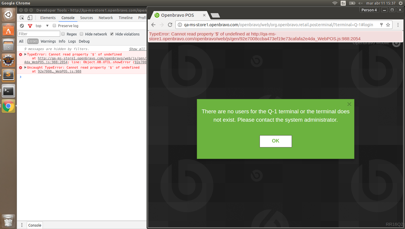 DescriptionTrying to access to a non existent terminal shows the following message: "There are no users for the Q-1 terminal or the terminal does not exist. Please contact the system administrator". Which is correct. But, in addition to that, some uncaught errors are shown and in the Chrome console appear some errors (attached).