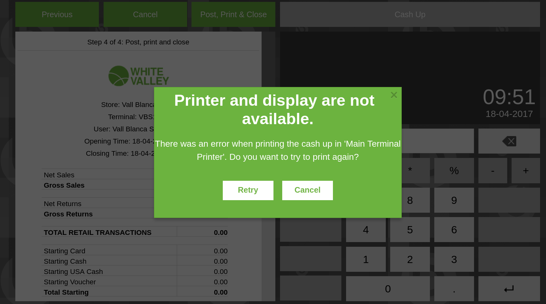 | Steps To Reproduce | 0-Login ERP as Openbravo and, using "The White Valley Group Admin" role go to POS Terminal window. 1-Select the "VBS POS Terminal" record (VBS-1 terminal) and fill "Hardware URL" field with the following value: http://localhost:9999/printer [^] (a wrong URL where printer will not be found). Save that record. 2-Go to POS (VBS-1 terminal) and login as Vallblanca. Printer will not be available. 3-Complete a cash up keeping nothing in each step. In the last step, just after clicking "Post, Print & Close" the successful message will not be shown and "Printer and display are not available." message will be shown instead. | |||||||||||