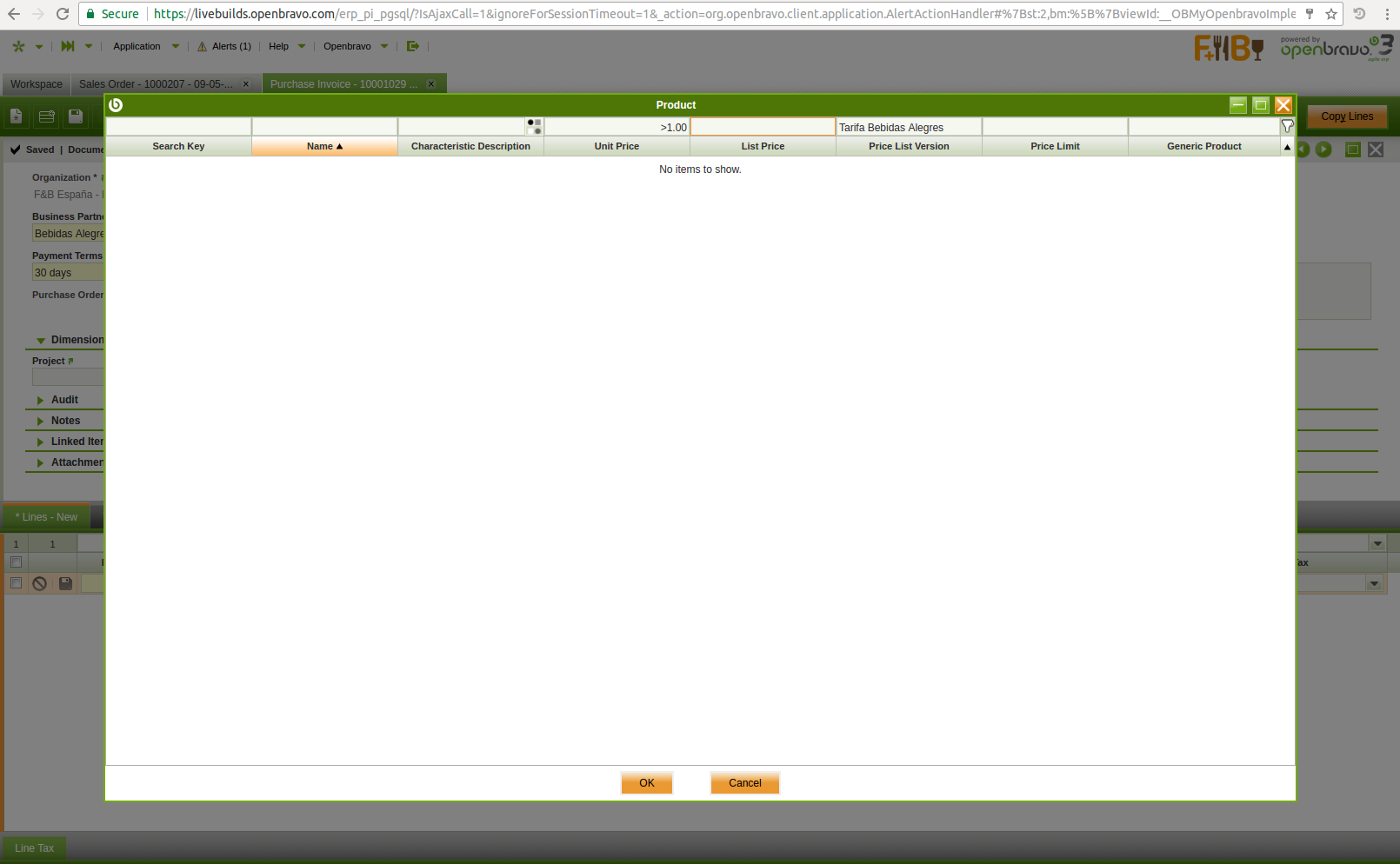 | Steps To Reproduce | 1) Open window [Purchase Invoice] and create a new record 2) Create a new line and open product selector (select lens icon) 3) Having a Price list set, filter by products with 'Unit Price' value >1 --> We got message no items to show | |||||||
