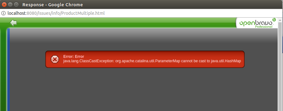 | Description | Product selector in Stock Report is not working when using Tomcat 7.0.76 or higher. The following error stack trace is shown after opening the selector pop-up: java.lang.ClassCastException: org.apache.catalina.util.ParameterMap cannot be cast to java.util.HashMap at org.openbravo.erpCommon.info.ProductMultiple.isCalledFromSoTrx(ProductMultiple.java:437) at org.openbravo.erpCommon.info.ProductMultiple.doPost(ProductMultiple.java:72) at org.openbravo.base.HttpBaseServlet.doGet(HttpBaseServlet.java:294) at javax.servlet.http.HttpServlet.service(HttpServlet.java:624) at org.openbravo.base.HttpBaseServlet.serviceInitialized(HttpBaseServlet.java:228) at org.openbravo.base.secureApp.HttpSecureAppServlet.service(HttpSecureAppServlet.java:455) This is caused due to a change introduced in Tomcat 7.0.76[1]. The ParameterMap[2] class is no longer extending HashMap. [1] https://bz.apache.org/bugzilla/show_bug.cgi?id=60808 [^] [2] https://github.com/apache/tomcat/commit/4e6c21d4f2fef36885d9f4945b31c38c30a95adf#diff-f426585723df91288b2aec48c27124e2 [^] | |||||||