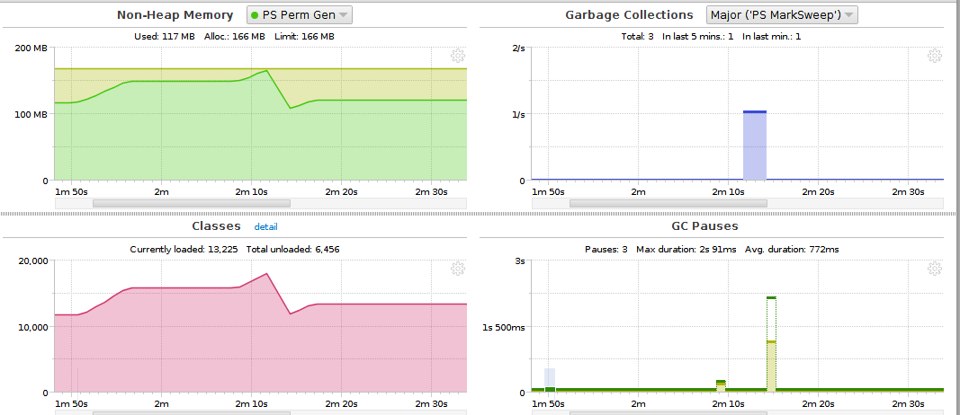 | Steps To Reproduce | To emulate it: 1. Apply attached diff that executes step 3 defined in description 2K times per callout 2. Limit PermGen (ie. 160MB) and monitor JVM 3. Open Sales Order window and click on new (this executes SL_Order_DocType and SL_Order_PriceList callouts) -> Check JVM graphs during execution (see attached image): * PermGen rapidly increases * This is caused to a big number of classes loaded * Finally, major GC collection cycles are triggered To detect wrong callouts, apply detect-callouts.diff and execute ClassLoaderTest. Attached the list of the 94 cases obtained in current pi. | |||||||