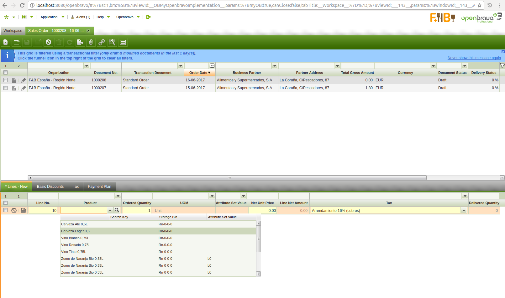 5) Open window [Sales Order] and create a new one for 'Alimentos y Supermercados' BP