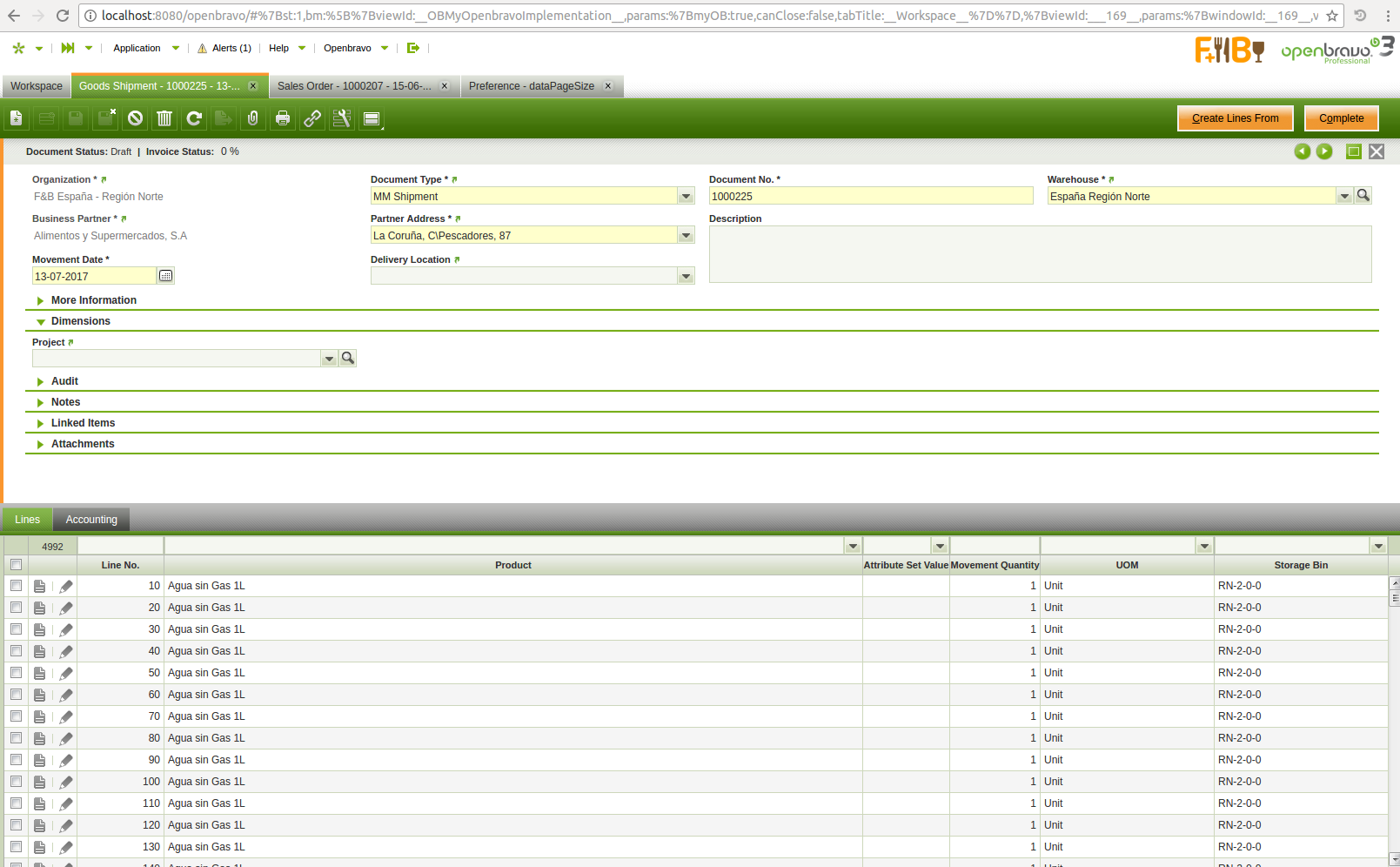 4) Open [Goods Shipment] window and create a new shipment for 'Alimentos y Supermercados' business partner. Then press button 'Create Lines From', and select the previously booked order. Wait the records to be loaded and select some warehouse position.