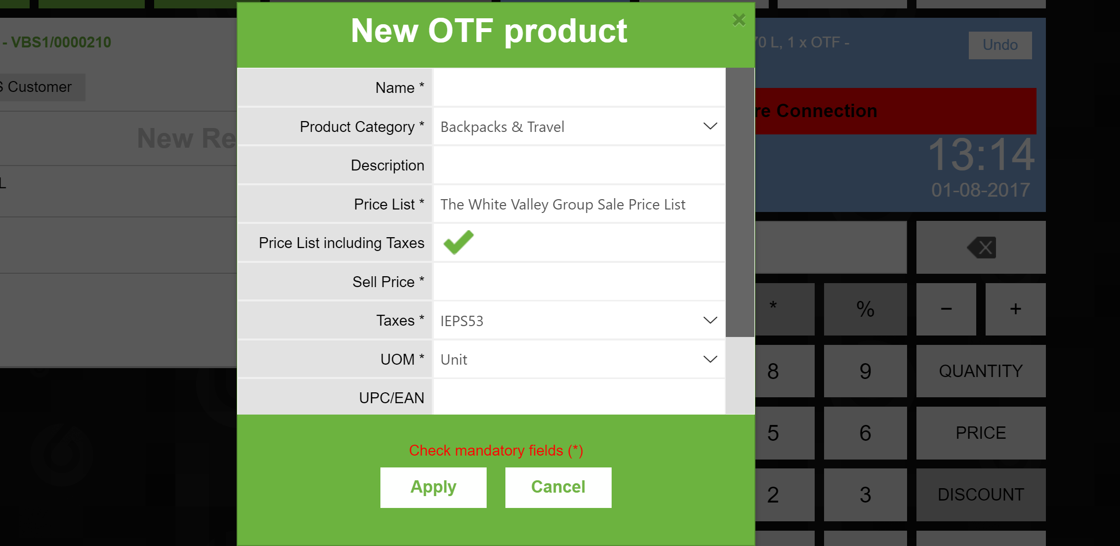 | Description | In New OTF product popup, if Apply button is pressed and there is some mandatory field that has not been filled, that field must be highlighted in red. Currently, they are not (check attached image). It can be checked in the following test case: https://testlink.openbravo.com/testlink/ltx.php?item=exec&feature_id=24788&build_id=233 [^] | |||||||||||