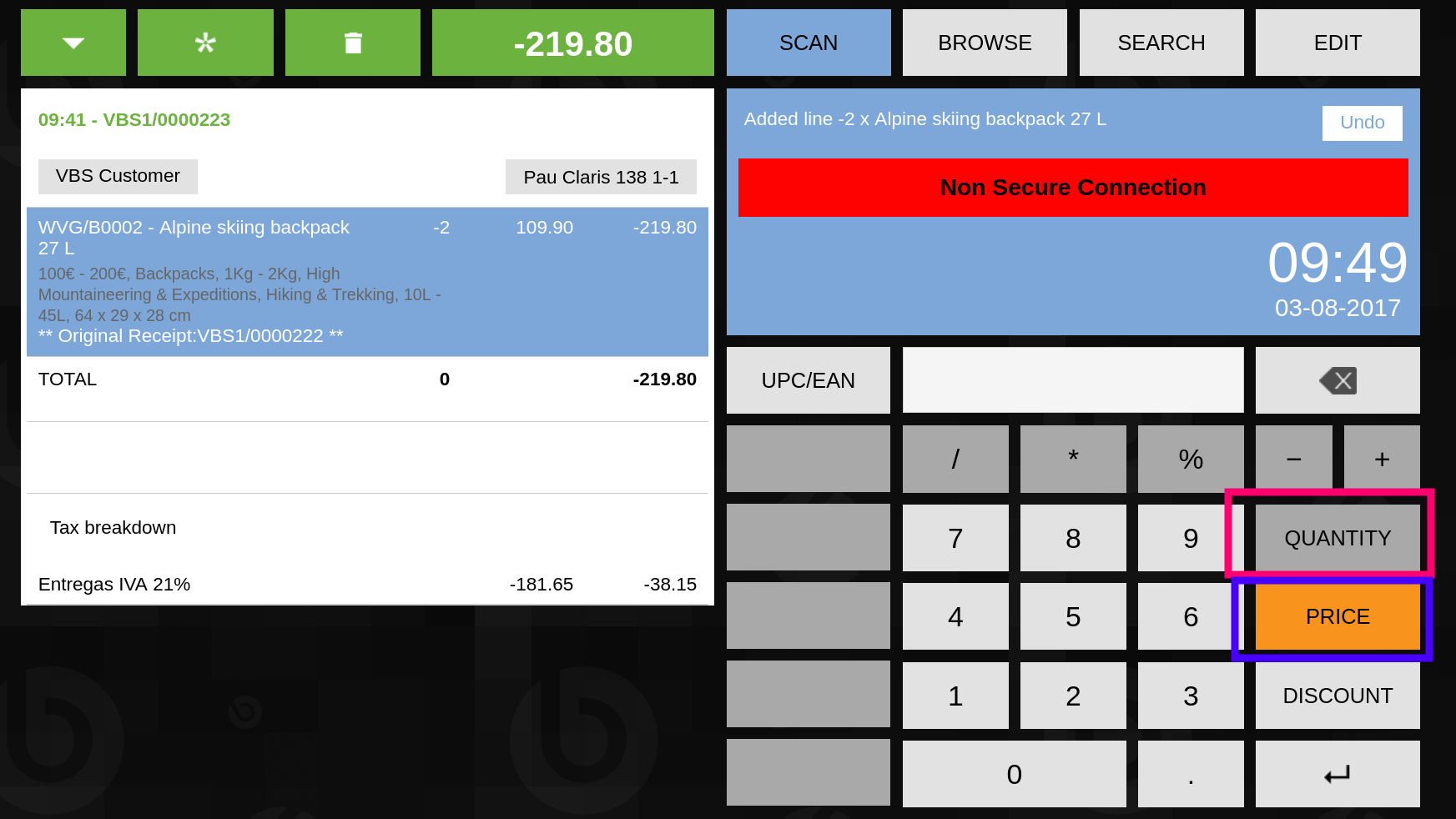 | Steps To Reproduce | Pre-condition: Create a receipt with the below details Login to POS terminal, go to the login URL: http://{server}/{context}/web/org.openbravo.retail.posterminal/?terminal=VBS-1 [^] Enter login credentials: "Username": vallblanca "Password": openbravo The POS window will appear. To add product click “Browse” button Then select “Backpacks & Travel” category And from the product list select Product: Alpine skiing backpack 27 L Quantity: 5 And verify the below details Product: Alpine skiing backpack 27 L Quantity: 5 Unit Price: 109.90 Total line amount: 549.50 Total Gross Amount: 549.50 Tax Breakdown Tax percentage: Entregas IVA 21% Taxable Amount: 454.15 Total Tax amount: 95.35 Then complete the receipt Return Receipt: Login to POS terminal, go to the login URL: http://{server}/{context}/web/org.openbravo.retail.posterminal/?terminal=VBS-1 [^] Enter login credentials: "Username": vallblanca "Password": openbravo The POS window will appear. To create return receipt, click “Verified Returns” option Verify Receipts popup appears in the screen In the Receipts popup, enter the receipt id which is created in Precondition Verify the above created receipt details appear in the search results Then click the Receipt id Verify a popup appears with receipt line item details Product Name: Alpine skiing backpack 27 L Tot. Qty: 5 Rem. Qty: 5 Qty:5 Price: 109.90 Then select the line item and change Qty:2 Then click “Apply” button And verify the below details Product: Alpine skiing backpack 27 L Quantity: -2 Unit Price: 109.90 Total line amount: -219.80 Total Gross Amount: -219.80 Tax Breakdown Tax percentage: Entregas IVA 21% Taxable Amount: -181.66 Total Tax amount: -38.14 Click the line item, Realise '+', '-' and 'QUANTITY' buttons are disabled, but PRICE is not. PRICE can be clicked, but it is worthless because an error message will be shown and the action will not be executed. | |||||||||||