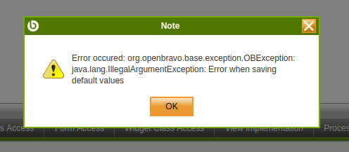 Error occured: org.openbravo.base.exception.OBException: java.lang.IllegalArgumentException: Error when saving default values