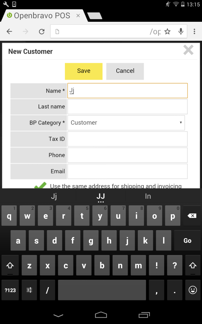 DescriptionCreating a new Customer with the Nexus tablet in portrait (vertical) mode, it is not possible to fill the fields below "Use the same address for shipping and invoice" sentence. The keyboard is hiding those fields and it is not possible to drag the window to be able to fill those fields.