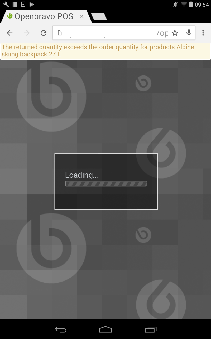 | Steps To Reproduce | 0-Login POS as vallblanca using the Nexus tablet. 1-Create a new receipt with 5x "Alpine transceiver" and complete it. 2-In dropdown menu, click in Verified Returns, then click magnifier and select the just created receipt. 3-Click the tick in the line of the Alpine transceivers, then delete the 5 number and put 3 instead. Apply to return 3 units of alpine transceivers and complete that return. 4-Once the previous receipt has been returned, click again in Verified Returns. Then click in the magnifier button and select the receipt of the Alpine Transceiver which has 3 units already returned. 5-Now, in the shown popup, click tick in the left of the Alpine Transceivers line and change the number 2 (units that can already be returned) to 3. Then click Apply button. DEFECT: Instead of change the background color to red and being unable to apply the action, it will show a Warning message (check attached image). It must be unified with the web POS application used through the PC. Besides, a warning message has no sense here but an error message. | |||||||||||