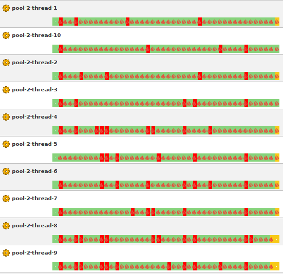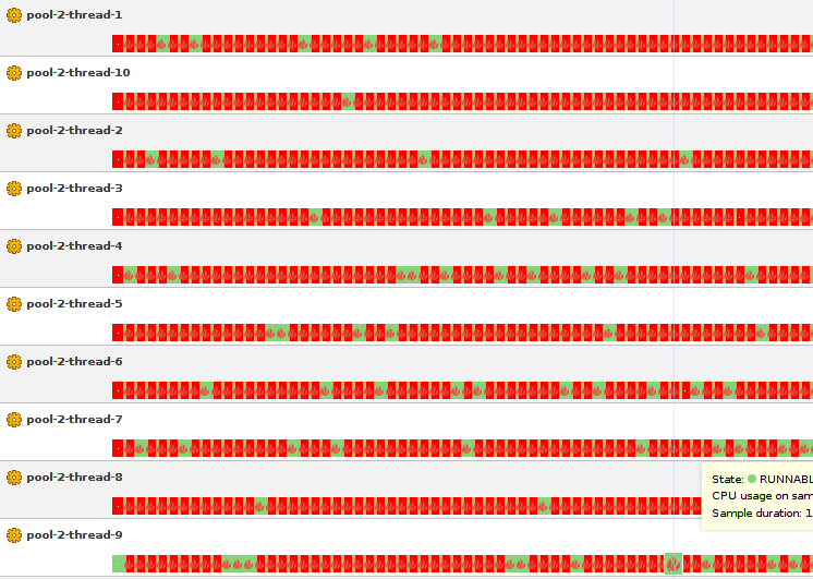 | Proposed Solution | Use a set backed from a ConcurrentHashMap so synchronization does not need to be done by external code, which simplifies the code as well as reduces contention limiting it to internal buckets rather than to the whole object. After this change time is reduced to 47s: 0 [main] INFO org.openbravo.test.system.Sessions - Starting 10 threads to create 10000 sessions each 45711 [pool-2-thread-6] INFO org.openbravo.test.system.Sessions - Thread finished in 45363 ms 46570 [pool-2-thread-4] INFO org.openbravo.test.system.Sessions - Thread finished in 46222 ms 46573 [pool-2-thread-1] INFO org.openbravo.test.system.Sessions - Thread finished in 46226 ms 46808 [pool-2-thread-2] INFO org.openbravo.test.system.Sessions - Thread finished in 46460 ms 47108 [pool-2-thread-7] INFO org.openbravo.test.system.Sessions - Thread finished in 46759 ms 47138 [pool-2-thread-8] INFO org.openbravo.test.system.Sessions - Thread finished in 46789 ms 47392 [pool-2-thread-9] INFO org.openbravo.test.system.Sessions - Thread finished in 47043 ms 47473 [pool-2-thread-5] INFO org.openbravo.test.system.Sessions - Thread finished in 47125 ms 47764 [pool-2-thread-10] INFO org.openbravo.test.system.Sessions - Thread finished in 47415 ms 47818 [pool-2-thread-3] INFO org.openbravo.test.system.Sessions - Thread finished in 47470 ms 47833 [main] INFO org.openbravo.test.system.Sessions - All finished in 47486 ms | |||||||