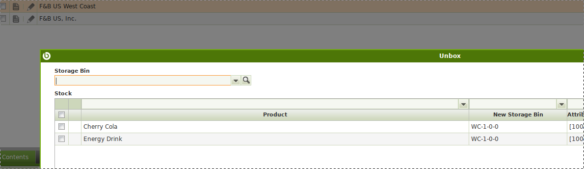 | Steps To Reproduce | This can be reproduced using the Referenced Inventory feature. As System Admin: Go to Process Definition and select "ReferencedInventoryUnBoxHandler" Add a new parameter: M_Locator_ID OBUISEL_Selector Reference On Hand Locator As F&B Admin: Go to Referenced Inventory Type and create a new record for F&B US Go to Referenced Inventory and create a new record for organization West. Link it to previous Referenced Inventory Type. Press Box button and select any line with any quantity. Press OK Now press Unbox button. Open selector at header level and clean any filter. Verify it only shows bin for West warehouse (OK) Open selector on any line in grid, clean any filter. Verify it shows all the bins regardless the organization. (WRONG) it should show the same bins as in the header. | |||||||