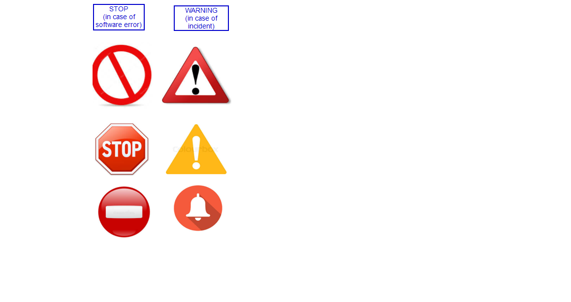 Hi David, a few amendments: 1. You write: "If the error is raised due to a software bug or an unexpected situation, it should be managed as it is done now. A new entry in the "Errors while confirming Task" Table is created and the Task is no longer visible for the user. The manager should manage this situation afterwards." -> I propose to SHOW the task, with a 'blocked' aspect, and inhabilitated. 2. You write: "The error is stored in a new Tab under the Task Window that could be named "Warnings while processing" -> I propose to name the subtab "Incidents", to leave 'space' for warnings, errors, notifications, ... 3. See attached suggestions for icon on the task, to indicate a STOP or a WARNING |