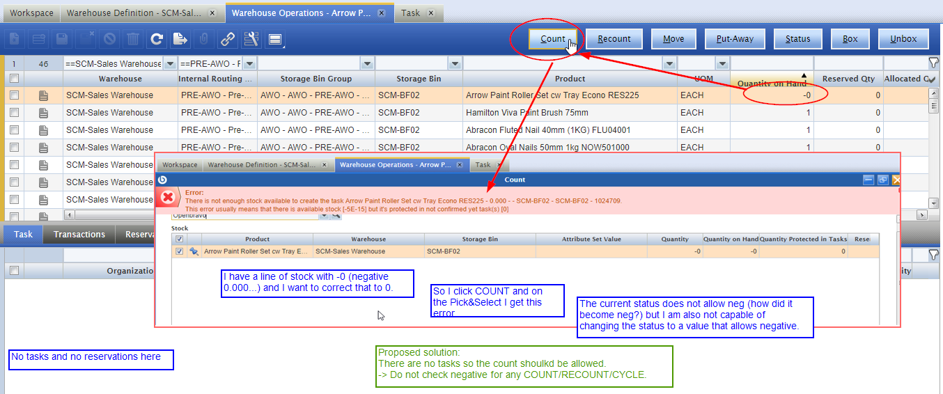 | Proposed Solution | Creating tasks will check if other tasks are comprimising the stock, tyhis is correct. But a COUNT/RECOUNT/CYCLE/STATUS should not check if the Qty is negative. | |||||||||||