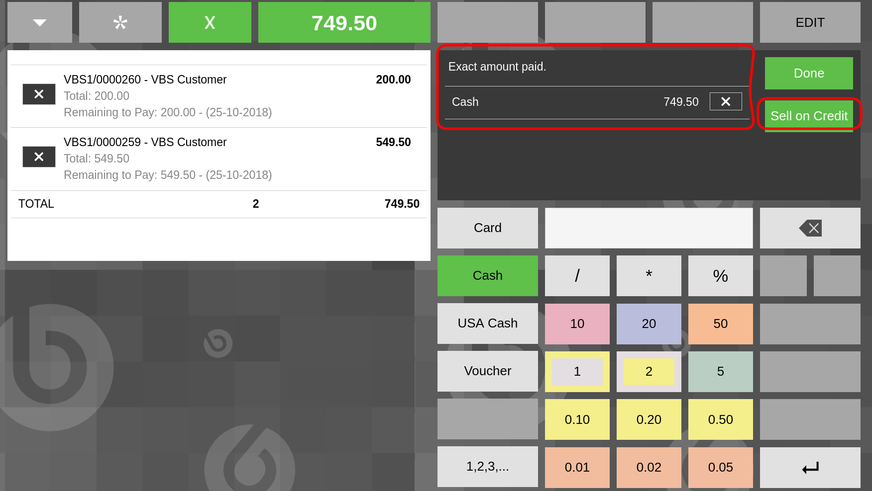 | Steps To Reproduce | 0-Active the feature of paying with credit with VBS customer. 1-Login POS as vallblanca. 2-In the blank receipt, add 5x "Alpine skiing backpack 27 L". 3-Create a new receipt clicking "*" button. In that new receipt add 1x "Baby carrier" and 1x "Base camp duffel 70 L". 4-In dropdown menu, click "Pay Open Tickets" option. 5-Click magnifier option, select the just created 2 receipts and click "Done" button. 6-Click Tick button and "Exact amount paid." will be shown. DEFECT: Realise "Sell on Credit" button is still present. 7-Click "Sell on Credit" button. Realise this must not be posible. Moreover, if you pay with credit now or even before clicking Tick button, the Sell on Credit feature will only pay 1 receipt, not all of them which, of course, breaks Pay Open Tickets flow. | |||||||||||