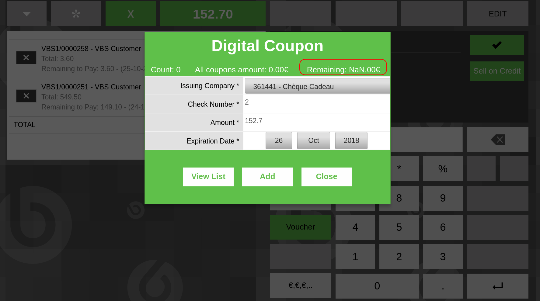 5-Click Total Amount button and click Voucher Payment Method. "Digital Coupon" popup will be shown. DEFECT: Realise "Remaining: NaN.00€" is shown.