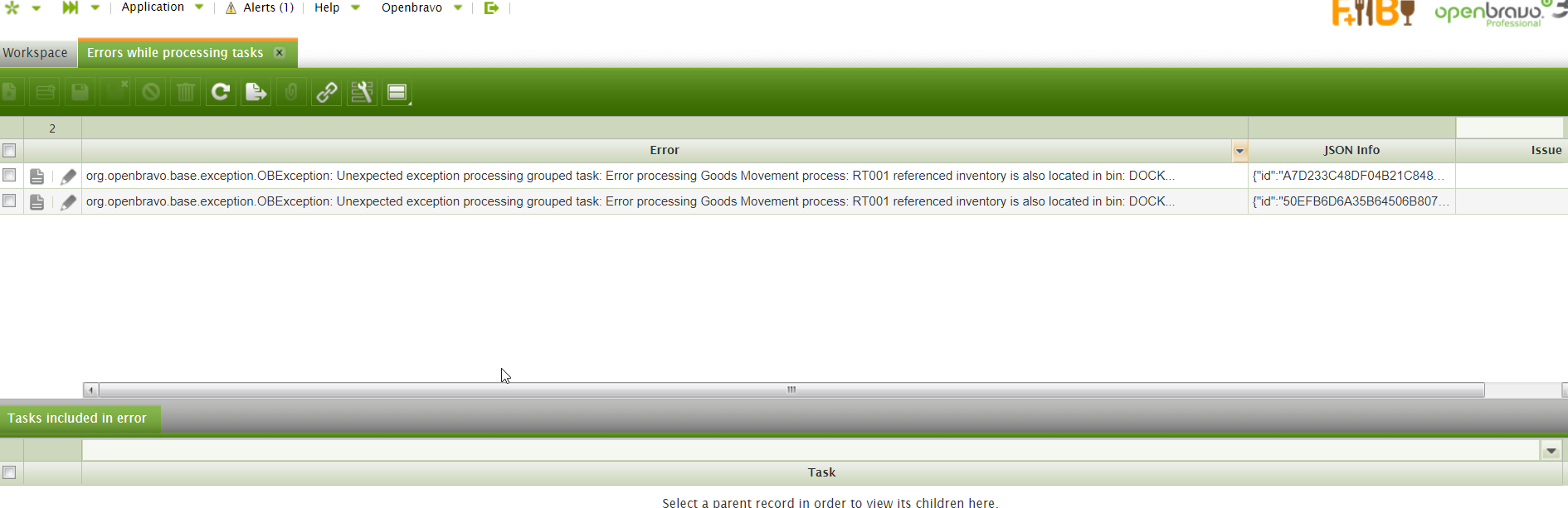 org.openbravo.base.exception.OBException: Unexpected exception processing grouped task: Error processing Goods Movement process: RT001 referenced inventory is also located in bin: DOCK