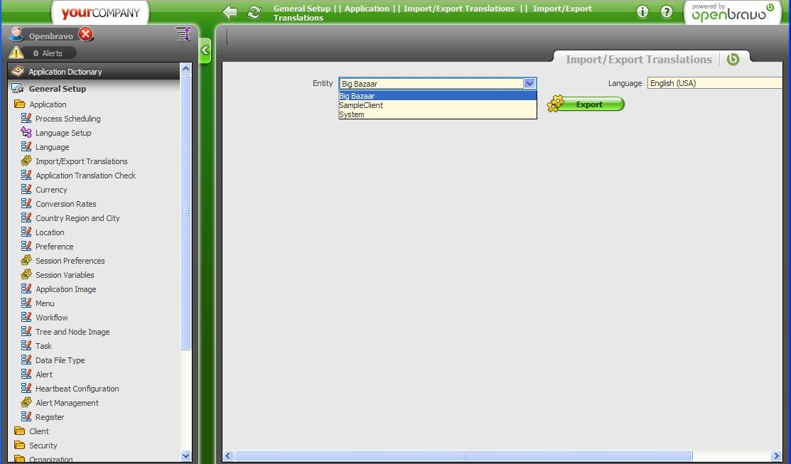 | Steps To Reproduce | 1. Go Languages 2. Search for Italian (Italy) 3. Mark it as System Language and click on Verify Languages 4. Go Import/Export languages, choose System and italian. Export. 5. Replace exported language by italian language pack downloaded from sourceforge. 6. Go Import/Export languages, choose Bigbazaar and italian. Import. 7. Recompile the application 8. When you log in again, if you change app language to Italian you will see everything in english. This will not happen if you choose System on step 6, but you will get not feedback about doing something wrong. | ||||||||||