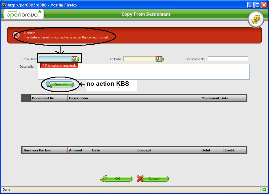 | Description | Copy from settlement. When it is opened and you click the search button without filling any date box the message that shows up it is not corrected. It should be the one that says that those fields are mandatory. Please ATTACH Also exists another bug. There is not a default action for button Search although it is in blue color. | |||||||