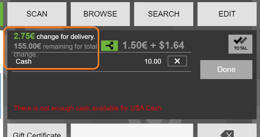 | Steps To Reproduce | 1. Login to POS terminal, go to the login URL: http://{server}/{context}/web/org.openbravo.retail.posterminal/?terminal=VBS-1 [^] 2. Click on the business partner button. 3. Select a customer with "Immediate" invoice terms and with "Multi change" option available 4. Click in the 'Browse' tab. 5. Add the 'Insect repellect' product 6. Add the 'Avalanche transceiver' product 7. Click on the 'Avalanche transceiver' product line 8. Click on 'Delivery Modes' button in the right-panel 9. Select Delivery Mode 'Pickup in store' 10. Click 'Apply' 11. Set product 'Avalanche transceiver' as Undeliverable and approve the change. 12. Click on the total amount button. The message '7.25EUR remaining to pay for delivery' is displayed 13. Add an amount of 10 in cash. The 'Action Required' pop up is opened 14. Select option 'Return to customer as 'change'.' The messages '2.75EUR change for delivery' and '15.00EUR remaining for total. 2.75EUR change.' are displayed 15. Click on the green button with the two arrows that is displayed in the change message The 'Change Split' pop up is opened 16. In the 'Cash' field add an amount of 1.50 The 'USA Cash' field should automatically update to 1.64 17. Press the OK button The messages '2.75EUR change for delivery' and '155.00EUR remaining for total. 1.50EUR + USD1.64 change' is displayed Note the wrong alignment in the attached screenshot. | |||||||||||