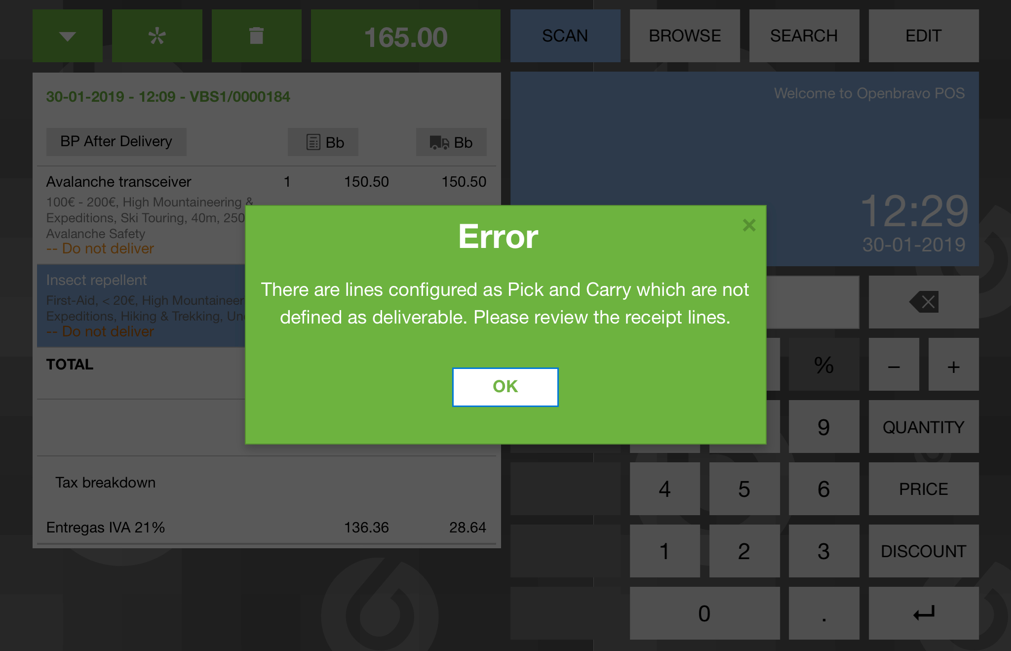 | Description | There's a typo in the error popup that is shown when trying to pay a ticket with some of it's items are set as non-deliverable when Pick and Carry delivery is set by default for the ticket. The message "There are lines configured as Pick and Carry which are not defined as deliverable. Please review the receipt lines." should actually say "There are lines configured as Pick and Carry which are defined as non-deliverable. Please review the receipt lines." or use either "not deliverable" or "undeliverable" as alternatives to "non-deliverable". This popup is depicted in the attachment image. | |||||||||||