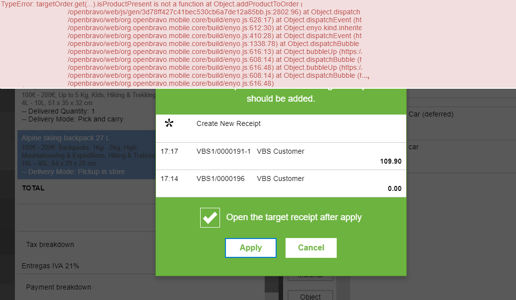 | Steps To Reproduce | 1. Create a simple ticket with one line, pay it and synchronize it. 2. Use the "Cancel and Replace" menu option to create a new version of the ticket created in the previous step. Let this new ticket open. 3. Create a new ticket and add a product which has a deferred product associated. 4. Pay this ticket and have it synchronized. 5. Seek for the ticket payed in step 4 and click the "services" icon. 6. Select the deferred service and, in the "Not Editable Receipt" pop up, pick the ticket created in step 2. See the error shown (attached screenshot) | |||||||||||