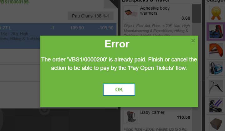 DescriptionThe result of attempting to pay an already paid ticket is a message saying "The order XXX is already paid. Finish o cancel the action to be able to pay by the 'Pay Open Tickets' flow.