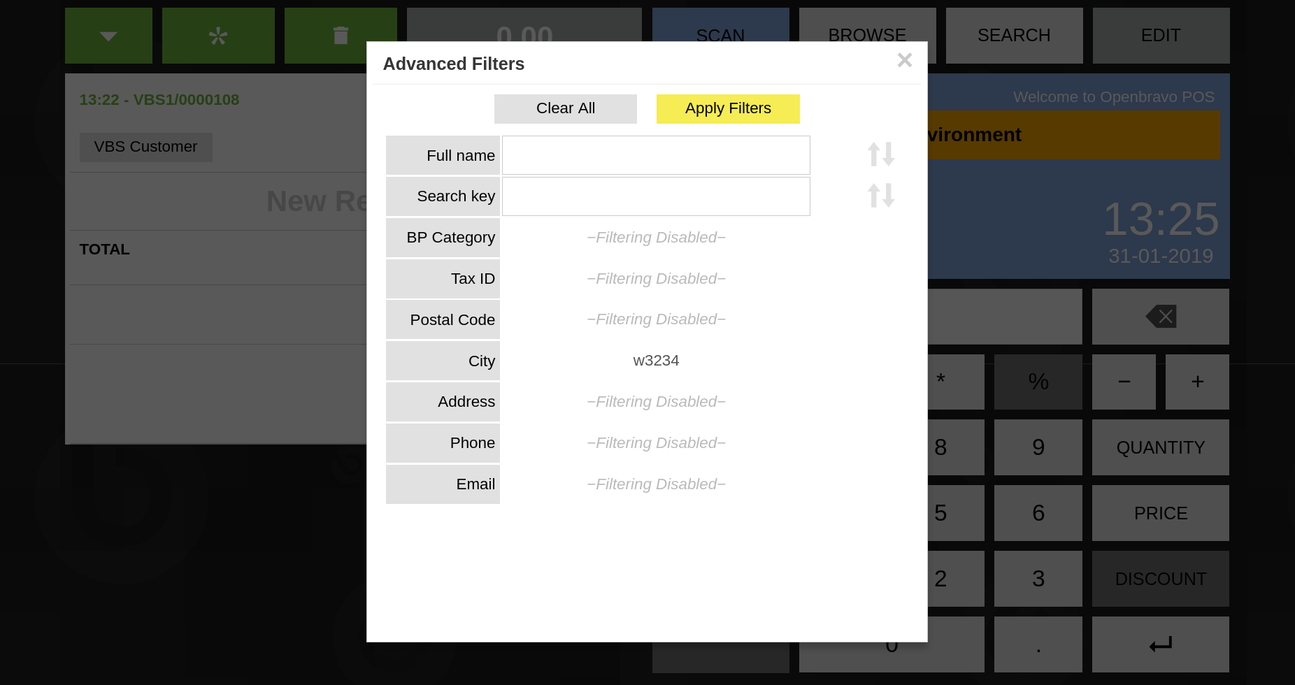 | Steps To Reproduce | In the backend, set the Preference "Enable Remote for Customer" with value 'Y' for "The White Valley Group" client. In the WebPos, open the BP selector, select 'City' on the drop-down and enter some value. We got an error because filtering is not allowed for that property. Then, select 'Full Name' on the drop-down and enter some value. We get the same error as before. Notice that if we click on 'Advanced Filters' we are getting both values, and if we click on 'Clear All' button, nothing happens. | |||||||