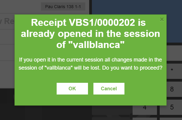 6. Use the menu option "Open Receipt" to seek and open the partially paid ticket (the one created in step 2). Note an error message is shown as if other user were working with the ticket.
