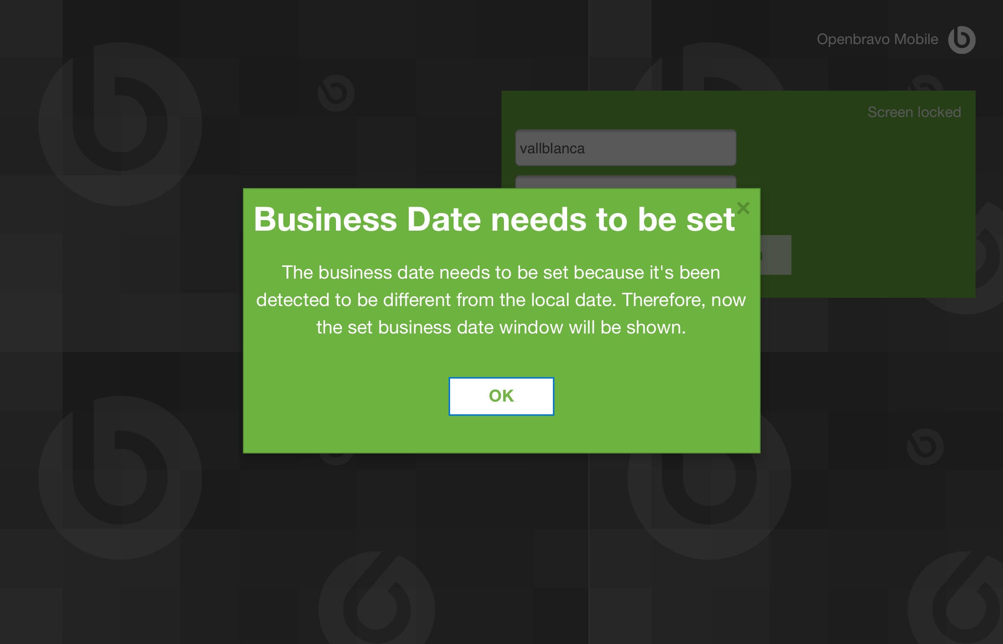 | Steps To Reproduce | These are the steps to the example of the Business Date setup popup to show up: -- In the Backend 0. Log in and change the role to "The White Valley Group Admin" 1. Open the "Close Store" window, set the organization the "Vall Blanca Store" and click on "Done". If any tills were open, manually select them in the emerging "Terminals and Tills Status" window, and repeat this step. 2. Open the "Open Store" window, set a date prior to today's date, and click on "Done". -- In the Web POS 0. Log in as user "vallblanca" -- Make the Business Date setup popup appear The popup should show upon login. If not, follow the following steps: 1. Once the Web POS is loaded, disconnect the network interface 2. Click "User" from the dropdown menu and click on "Lock" option in the emerging popup 3. Log back in the POS *¹. The popup as in the attached picture appears showing a "close" icon on the top right corner *². Dismiss the popup either by clicking on the "close" icon or by clicking out of the popup NOTICE that a this point there are no working alternatives to set the Business Date | |||||||||||