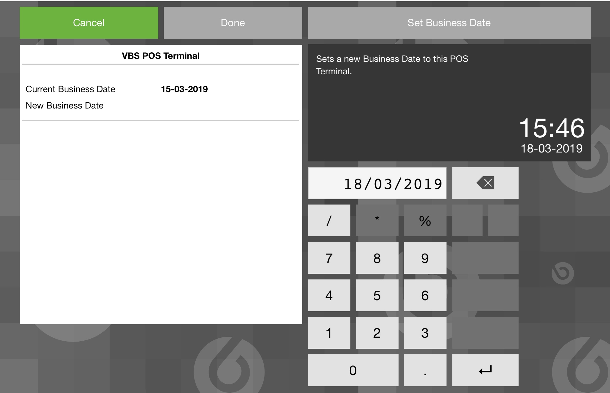 | Description | The keyboard pane in the Set Buisiness Date window shows incorrectly sized and with bad padding on iPad | |||||||||||