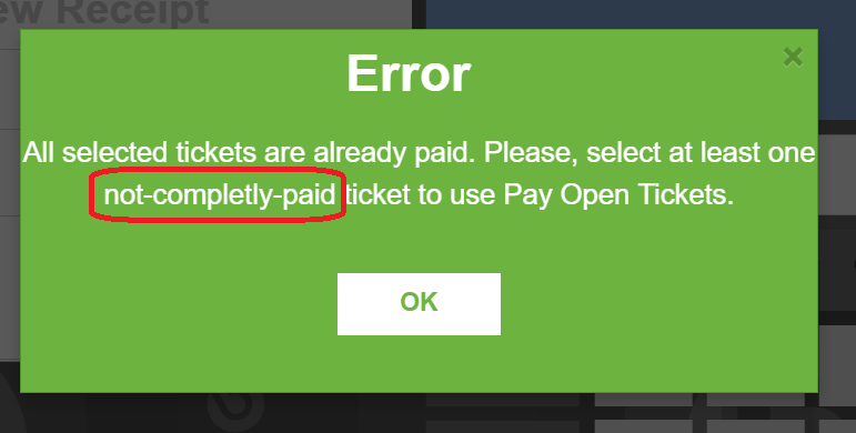 All selected tickets are already paid. Please, select at least one not-completly-paid ticket to use Pay Open Tickets.