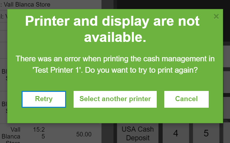 | Steps To Reproduce | 1. Having the terminal set to always select a printer, create a ticket and pay it. 2. The expected message to select a printer is shown. Select a printer that is not available to print. 3. The expected message informing the ticket cannot be printed is shown. Notice the two buttons "Retry" and "Select Another Printer". 4. Click the Retry button. You are prompted to select a printer. Select the same printer. The message in step 3 is shown again. 5. Click the Select Another Printer button. You are prompted to select a printer. Select the same printer. The message in step 3 is shown again. | |||||||||||