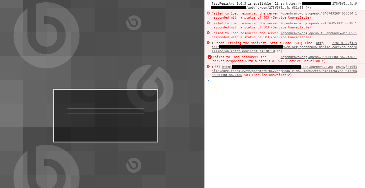 | Steps To Reproduce | 1. Use a properly configured server and login using the webPOS 2. Check you are logged in online as expected. 3. In the server, stop tomcat service. 4. In the terminal create a ticket, check you are taken offline as expected. 5. Log out, the login window is not shown and a blank page (with a console error) is shown. See attached image. | |||||||