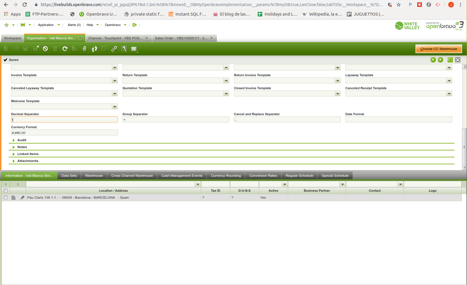 | Steps To Reproduce | In the backend, open 'Vall Blanca Store' record in Organization window and set the following values: - Decimal Separator: '!' - Group Separator: '=' - Currency Format: '#,##0.00' Open WEB POS (VBS-1 terminal) and add some products. You can check the separators shown are incorrect | |||||||||||
