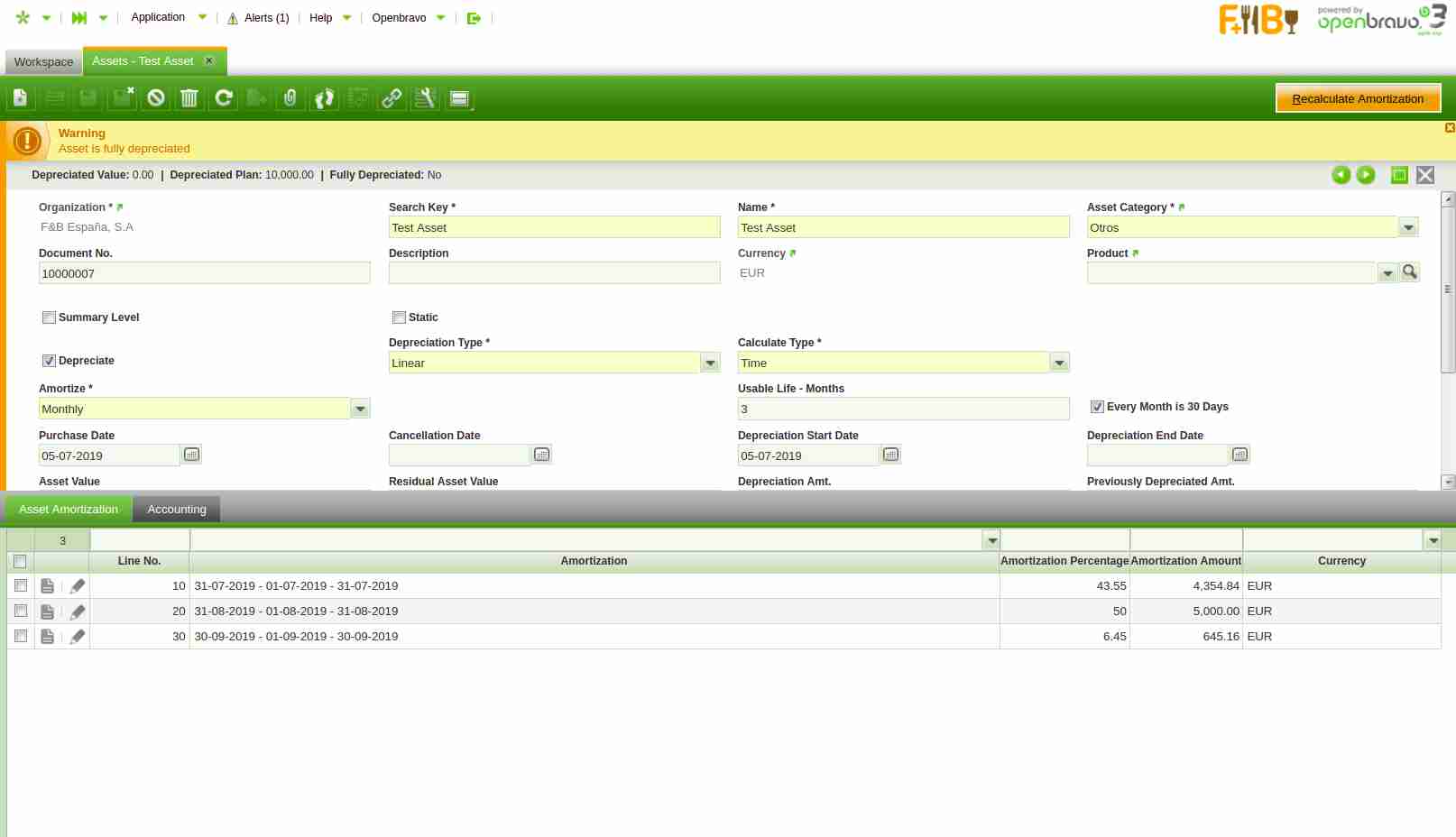 | Steps To Reproduce | In Livebuils go to Assets window Create a new asset there with below setup: Organization - F&B EspaƱa Search Key - Test Asset Name - Test Asset Asset Category - Otros Check "Depreciate" flag. Select Depreciation Type = Linear Calculate Type = Time Amortize = Monthly usable life-months = 2 Depreciation Amt = 10000 Depreciation Start Date = Purchase Date = current date Run amortization by clicking on Create Amortization. Go back to the header and change usable life months to 3 Run amortization by clicking on Create Amortization. Vefify an error is shown saying that the asset is fully depreciated. See image attached. This is not correct. Now delete all the lines and run recalculate Amortization process. The process works. | |||||||