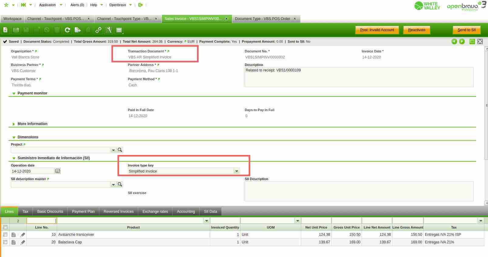 | Proposed Solution | Once the changes described in the document below are implemented, Openbravo Web POS need to assign the correct "Clave de Tipo Factura", as described below: https://docs.google.com/document/d/14sfEAWuMZgSBKgKP8WTLkKRiEsHGaOxsjIROy3Guz-Y/edit [^] (1) Channel toucpoint type parameter "Generate Simplified Invoices" = Yes This configuration will create a sales invoice with the value "VBS AR Simplified Invoice" in the field "Transaction Document" (Document Type for Simplified Invoices, in the backoffice). In such cases the value of the SII field "Invoice Type Key" must be "Simplified Invoice". See image "Simplified Invoice". (F2) (2) POS menu option "Issue Invoice" is used, regardless Channel Touchpoint type configuration. This configuration will create a sales invoice with the value "AR Invoice" in the field "Transaction Document" (Document Type for Invoices, in the backoffice). In such cases the value of the SII field "Invoice Type Key" must be "Invoice". See image "Invoice". (F1) (3) Partial or total Returns (Verified or Blind). Channel toucpoint type parameter "Generate Simplified Invoices" = Yes This configuration will create a negative Sales Invoice, originated from a RFC Order having a given document type in the field "Document Type for Simplified Invoices", for instance "Reverse Sales Simplified Invoice". In such cases the value of the SII field "Invoice Type Key" must be "Corrective Invoice", the value of the field "Rectification Invoice Type" must be "Differences" and the value of the field "Rectification Reason" must be " R5 - Simplified Invoice" - See image "Reverse Simplified Invoice". (R5) (4) Partial or total Returns (Verified or Blind). POS menu option "Issue Invoice" is used, regardless Channel Touchpoint type configuration. This configuration will create a negative Sales Invoice, originated from a RFC Order having a given document type in the field "Document Type for Invoices", for instance "Reverse Sales Invoice". In such cases the value of the SII field "Invoice Type Key" must be "Corrective Invoice", the value of the field "Rectification Invoice Type" must be "Differences" and the value of the field "Rectification Reason" must be " R1 - Founded error " - See image "Reverse Invoice". (R1) | |||||||