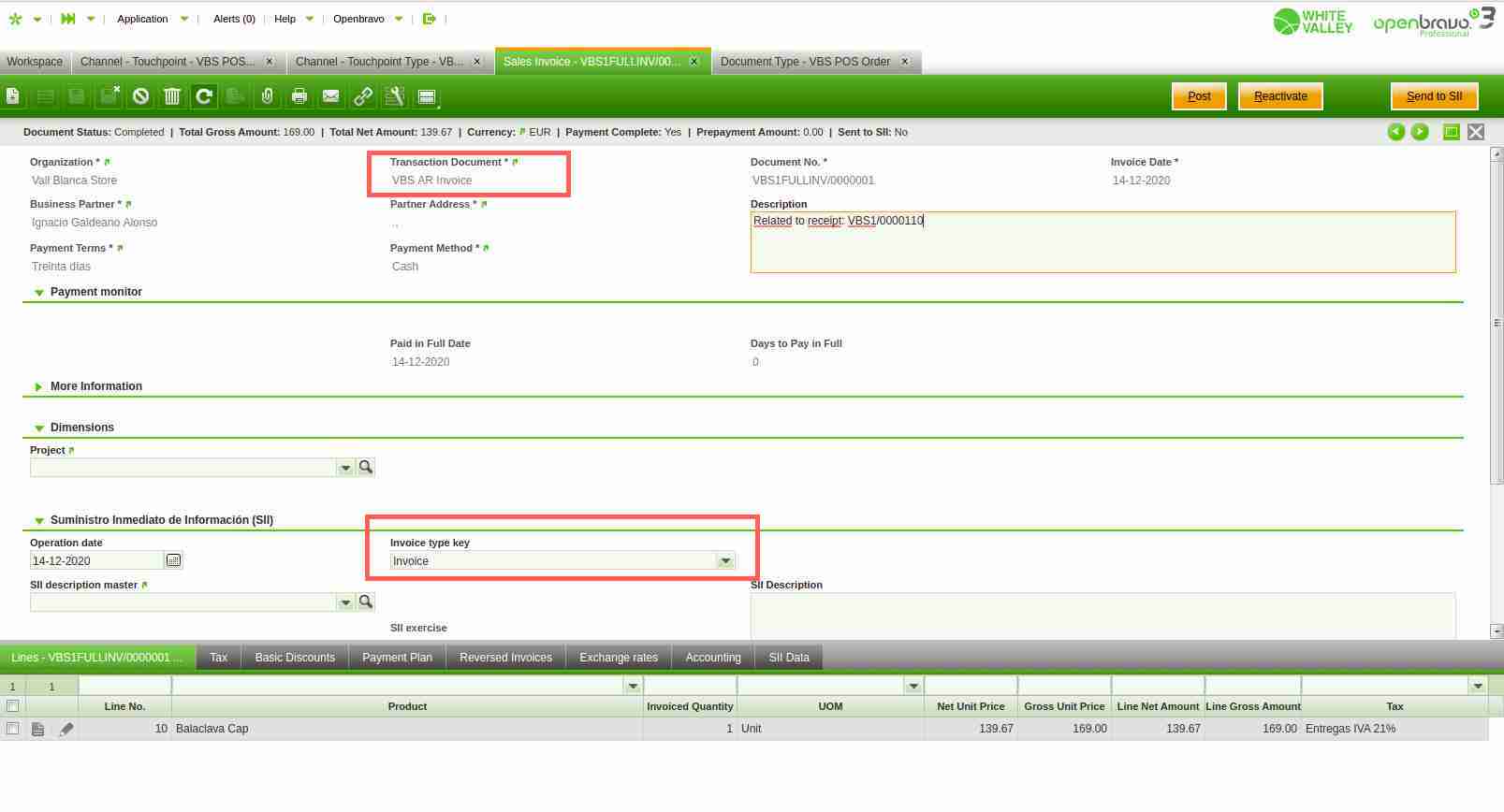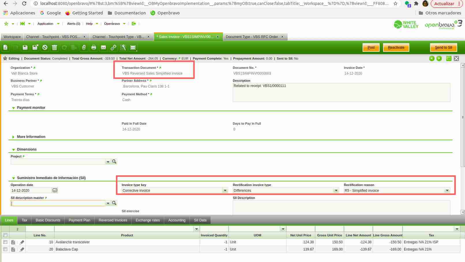 Additional Test Plan - Blind Returns Test 6 -Login into Web POS using vallblanca user - In Menu select "Return this Receipt", select any product. Complete and pay the return sale. - Go to the backoffice - Navigate to Sales Invoice, select record created for previous return Ticket created in WebPOS. - Realize that Transaction Document is set as "VBS Reversed Sales Simplified Invoice", Invoice Type Key is set as "Corrective invoice", Rectification invoice type is set as "Differences", Rectification Reason is set as "R5 - Simplified invoice". Test 7 -Login into Web POS using vallblanca user - In Menu select "Return this Receipt", select any product. Select the end-customer Arturo Montoro - Select Menu option "Issue Invoice". Realize that Invoice flag appears as Yes. - Complete and pay the return sale. - Go to the backoffice - Navigate to Sales Invoice, select record created for previous return Ticket created in WebPOS. - Realize that Transaction Document is set as "VBS Reversed Sales Invoice", Invoice Type Key is set as "Corrective invoice", Rectification invoice type is set as "Differences", Rectification Reason is set as "R1 - Founded error". |