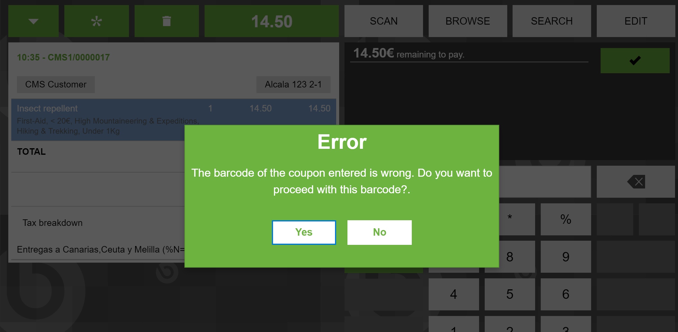 | Description | It is supposed to enter a wrong barcode must result in the following message: "The barcode of the coupon entered is wrong. Please review the barcode". Instead of that, it is shown: "The barcode of the coupon entered is wrong. Do you want to proceed with this barcode?. YES NO" https://testlink.openbravo.com/testlink/linkto.php?tprojectPrefix=Communit&item=testcase&id=Communit-11422 [^] | |||||||||||