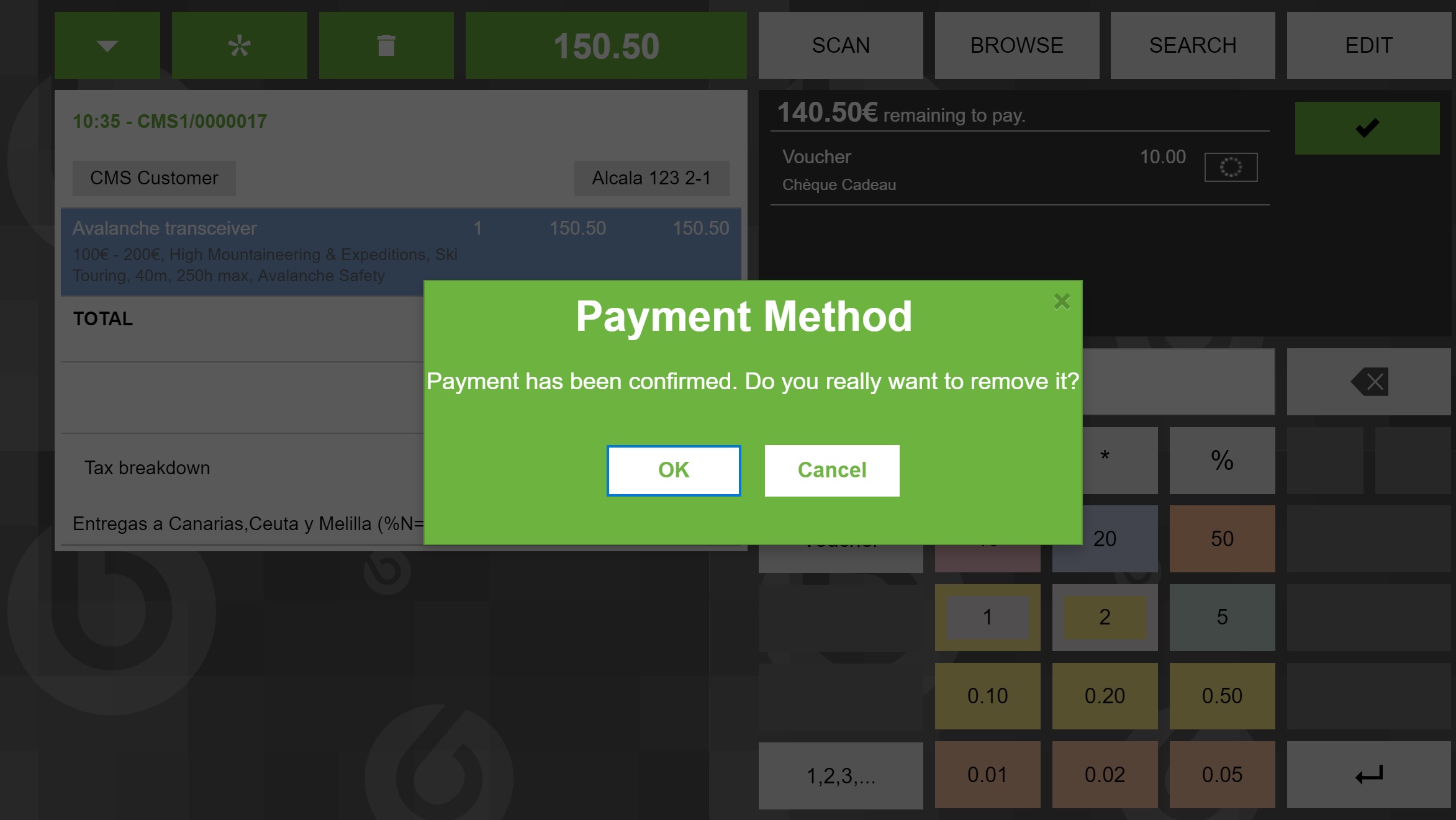 4-The payment must be added now. Click The "x" button to remove that payment. A message will be shown. DEFECT: No padding assigned in that message.