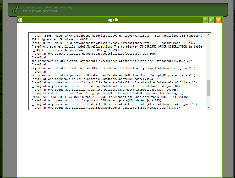| Steps To Reproduce | In order to reproduce the issue it is required to install via the MMC a module with an error like this one: [java] org.apache.ddlutils.model.ModelException: The foreignkey EM_OBRESMS_ORDER_RESERVATION in table C_ORDER references the undefined table OBRE_RESERVATION Launching the Rebuild process, it finishes (or seems to finish) successfully, since a green banner "Process Completed Successfully" is shown. But looking at the log shows a different story (the error message shown above is from the log) For more information, check the attached screenshot. The full log is also available on demad. | |||||||