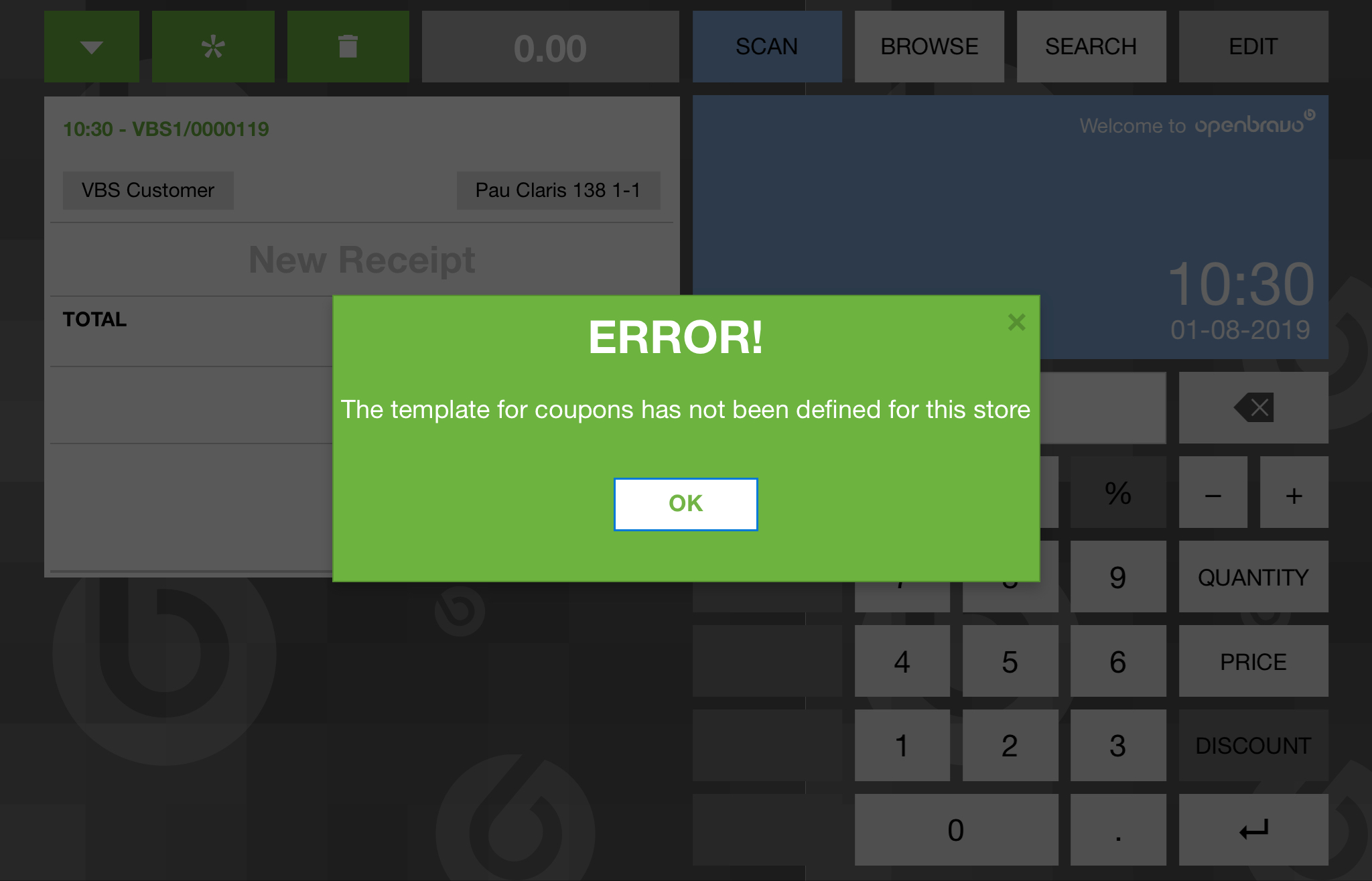 NOTICE that an error popup appears with the following message: "ERROR! The template for coupons has not been defined for this store"