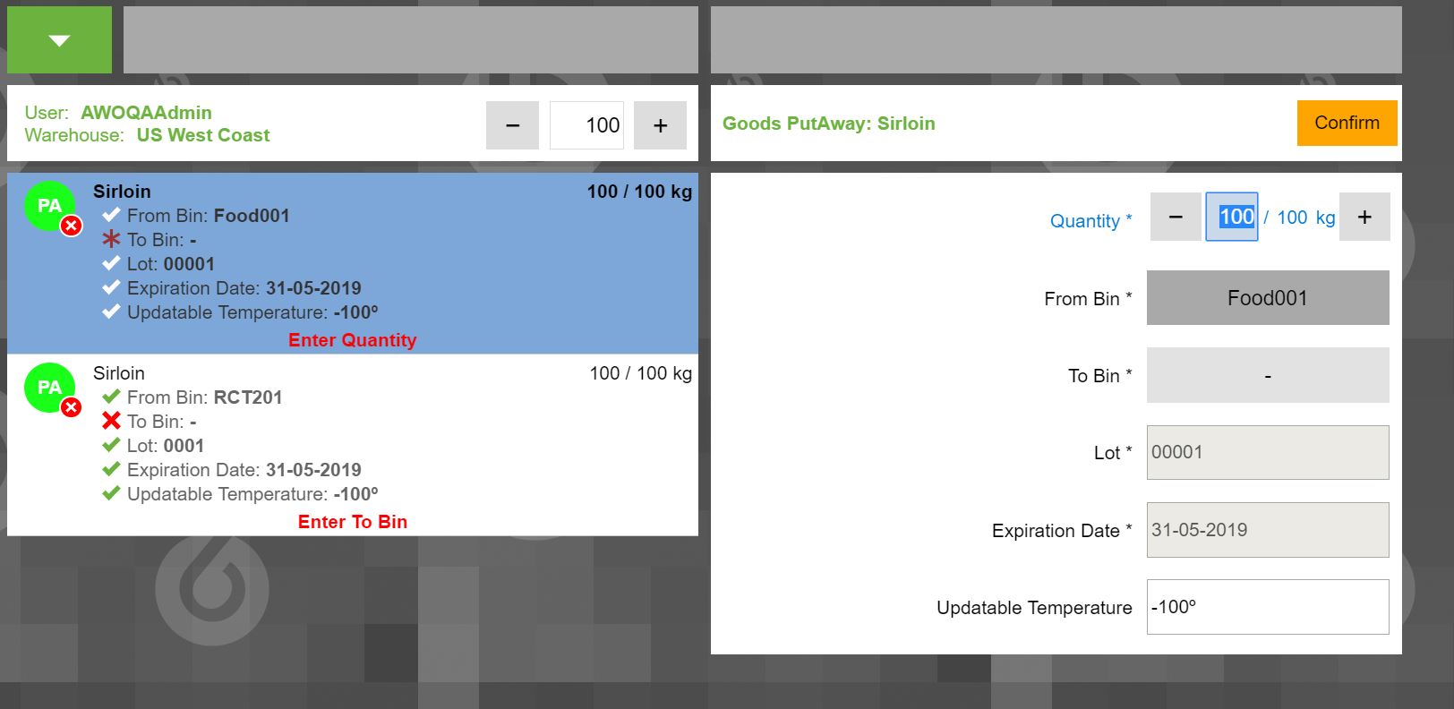 | Steps To Reproduce | 1. Log into https://livebuilds.openbravo.com/retail_modules_pgsql_pi/web/org.openbravo.warehouse.advancedwarehouseoperations [^] with user AWOQAAdmin and warehouse US West Coast. 2. Open the menu option Put Away 3. Select the product Sirloin in storage bin RCT201. CHANGE 1: When the user scan a product and the system returns just one result, the focus should be in In the right panel, the focus should be in the Qty and the text shoud be selected. Same change for others product selectors. See image ForceTextSelecction3 4.Select the line. CHANGE in the right panel, the focus should be in the Quantity field an the text should be selected. See image ForceTextSelecction4. Same change about text selected for another text fields when they are selected. | |||||||