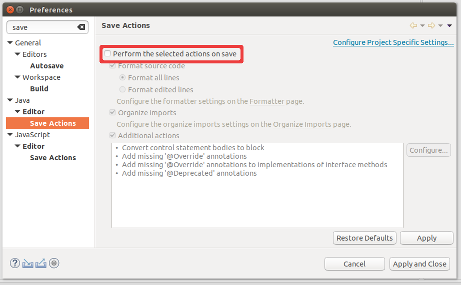 | Description | Currently Eclipse auto save actions must be manually enabled (see attached image). It would be nice if this setting could be exported into the project settings so it is enabled automatically after importing the preferences file. | |||||||