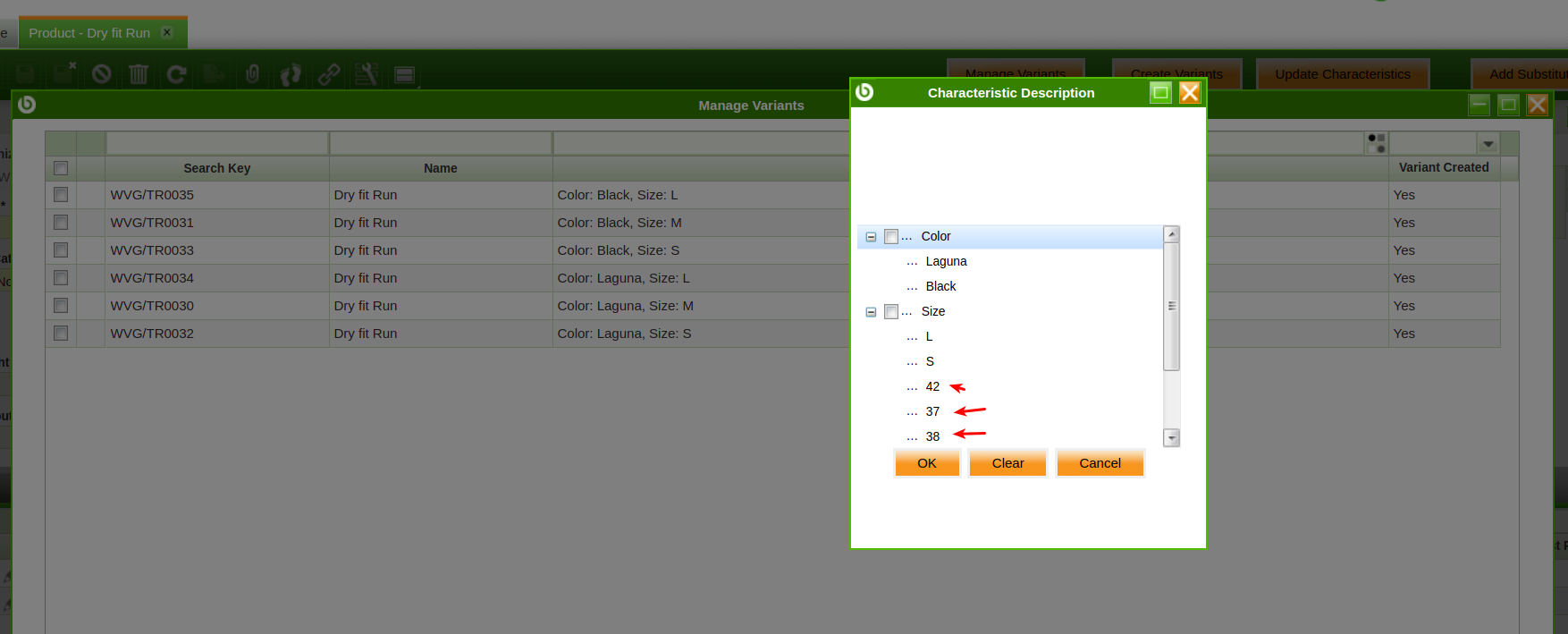 | Steps To Reproduce | Tested in retail_pi_pgsql: Go to product window Choose a product with characteristics (Dry fit Run) Click on manage variant The pop up filter show you characteristics that the product doesn't has If you have many characteristics it is complicated to filter | |||||||