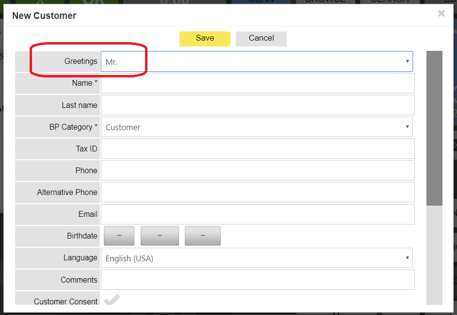 DescriptionWhen creating a new customer, it is possible to pick a greeting. The label for the text says "Greetings" in plural.