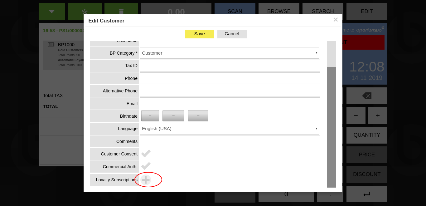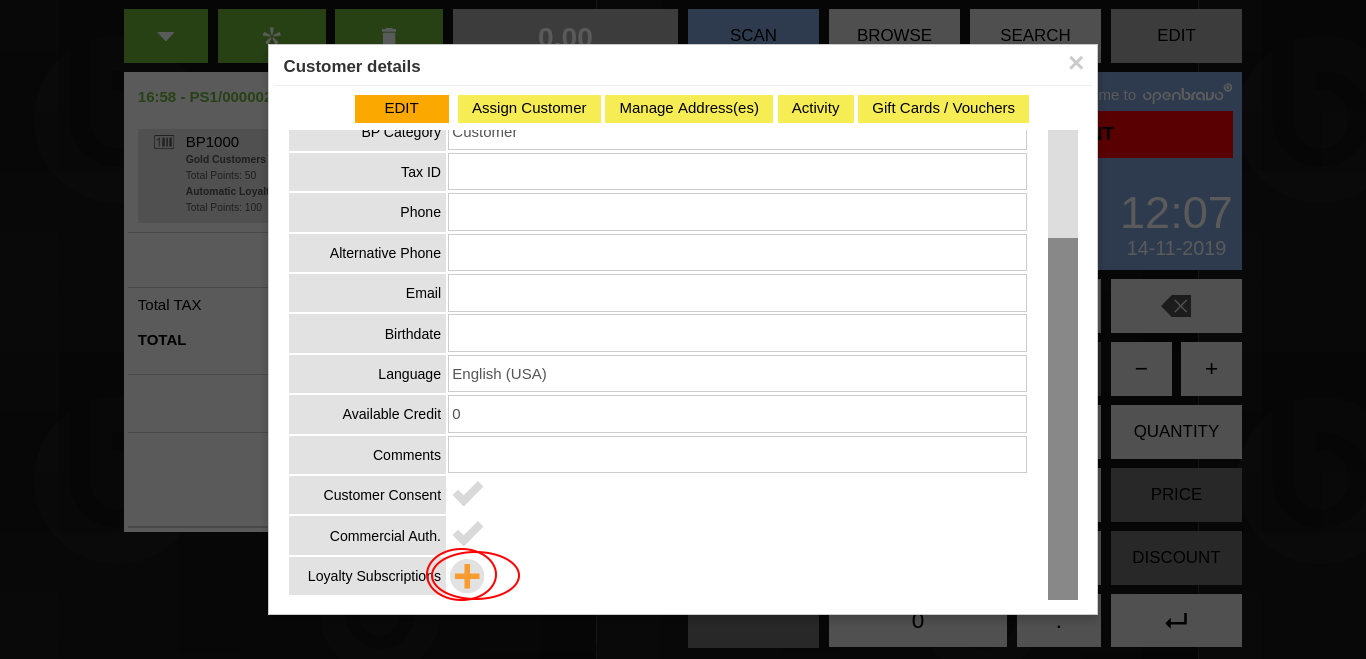 | Steps To Reproduce | PRECONDITION: "Loyalty Programs" and "Loyalty Programs for Web POS" modules must be installed. -- In the ERP: perform basic setup for Loyalty Programs (as shown in the OB Wiki page: http://wiki.openbravo.com/wiki/Projects:Loyalty_Programs/User_Guide#Who_can_subscribe_clients.3F [^]) 0. Log in the ERP and change the role to "The White Valley Group Admin" 1. Go to "Channel - Touchpoint Type" an open a record in form (p.e. VBS POS Terminal Type) 2. In the "Loyalty" section, check the "Enable Loyalty Features" box, and check the newly shown "Can Subscribe to Loyalty Programs" box 3. Go to the "Document Sequence" window, and create a new record for the "The White Valley Group" organization 4. Go to "Loyalty Program" window and create a new record with the previously created document sequence set in the "Member Identifier Sequence" field -- In the POS 0. Log in a terminal belonging to the loyalty program enabled terminal type; in this case, VBS-1 Two possible ways to get to "Customer details" popup (1) 1. Click on the contextual button (three vertical dots) on a customer which isn't the annonymous one, and click on the "View Details" option (2) 1. Click on the customer ticket header button and click on the "* New Customer" button Create a customer with the mandatory fields, and click the "Save" button 2. In the "Customer details" window try to add a "Loyalty Card" by clicking in the orange "plus" shaped button at the bottom of the "Customer details" popup (depicted in loysub-custdet-step2.png) NOTICE that the "Select a Loyalty Program" popup is prompted accordingly, which is as expected 3. Click on the "EDIT" button, and try to click on the now greyed out plus button (depicted in loysub-editcus-step3.png) NOTICE that nothing happens, which is as expected, but no warning message appears explaining that it isn't the correct flow to add the Loyalty Card with | |||||||