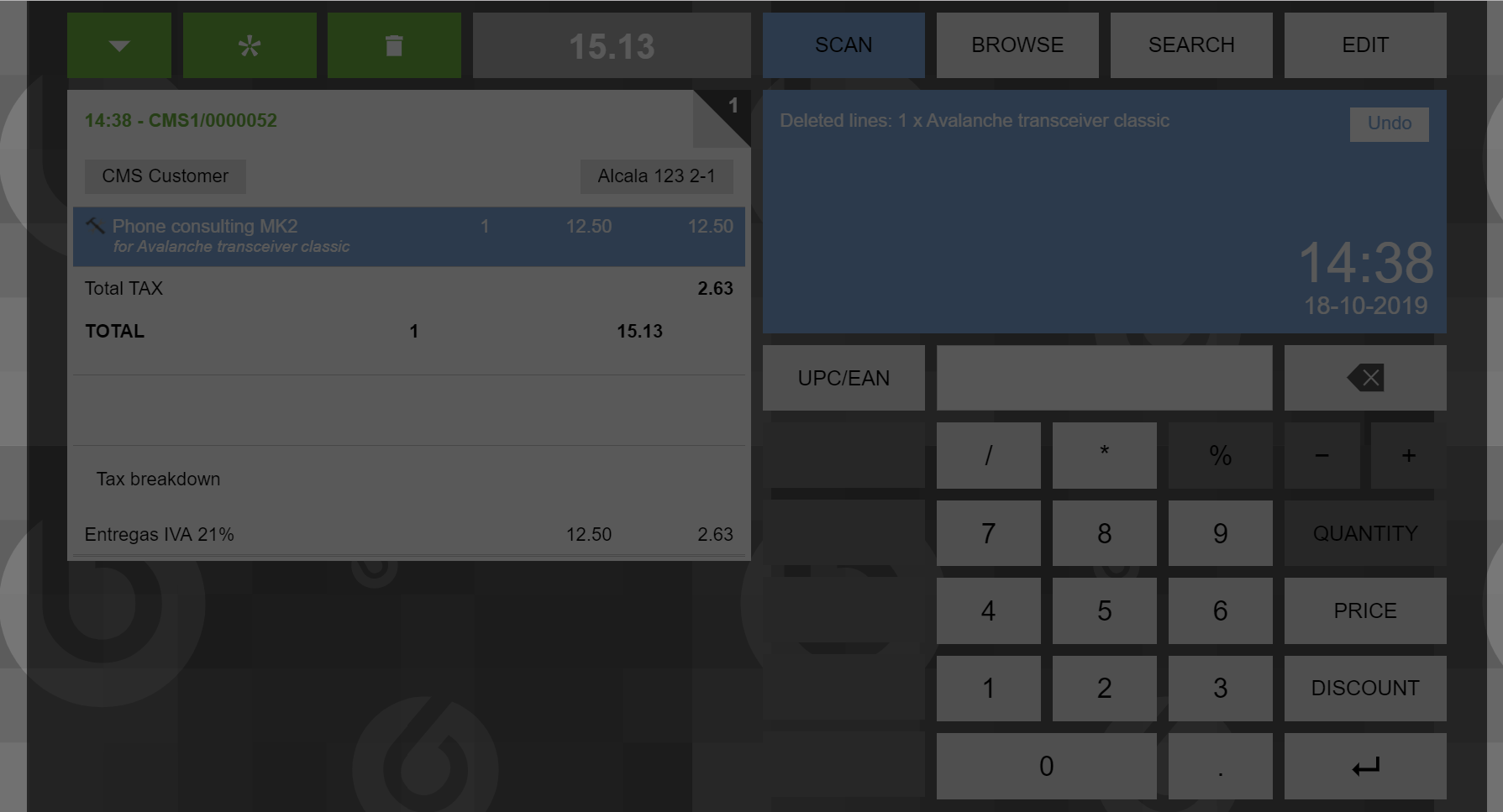 | Steps To Reproduce | Login to POS terminal, go to the login URL: http://{server}/{context}/web/org.openbravo.retail.posterminal/?terminal=VBS-1 [^] Enter login credentials: 'Username': vallblanca 'Password': openbravo The POS window will appear. 1. Click on 'SEARCH' tab 2. Search for 'Avalanche transceiver classic' and add to the recepit 3. Add the 'Phose consulting MK2' suggested service 4. Click on the 'CONTINUE' button 5. Click the 'Layaway this receipt' button on the menu 6. Click on the total amount button 7. Click on the 'Layaway' button 8. Click on the 'Open receipt' menu entry 9. Search for the last layaway 10. Click on 'Cancel this layaway' menu entry 11. Finish the cancel by clicking 'Done' button 12. Click on the 'OK' button 13. Select the 'Avalanche transceiver classic' product 14. Click on the 'Delete' button. DEFECT: POS gets suck. | |||||||