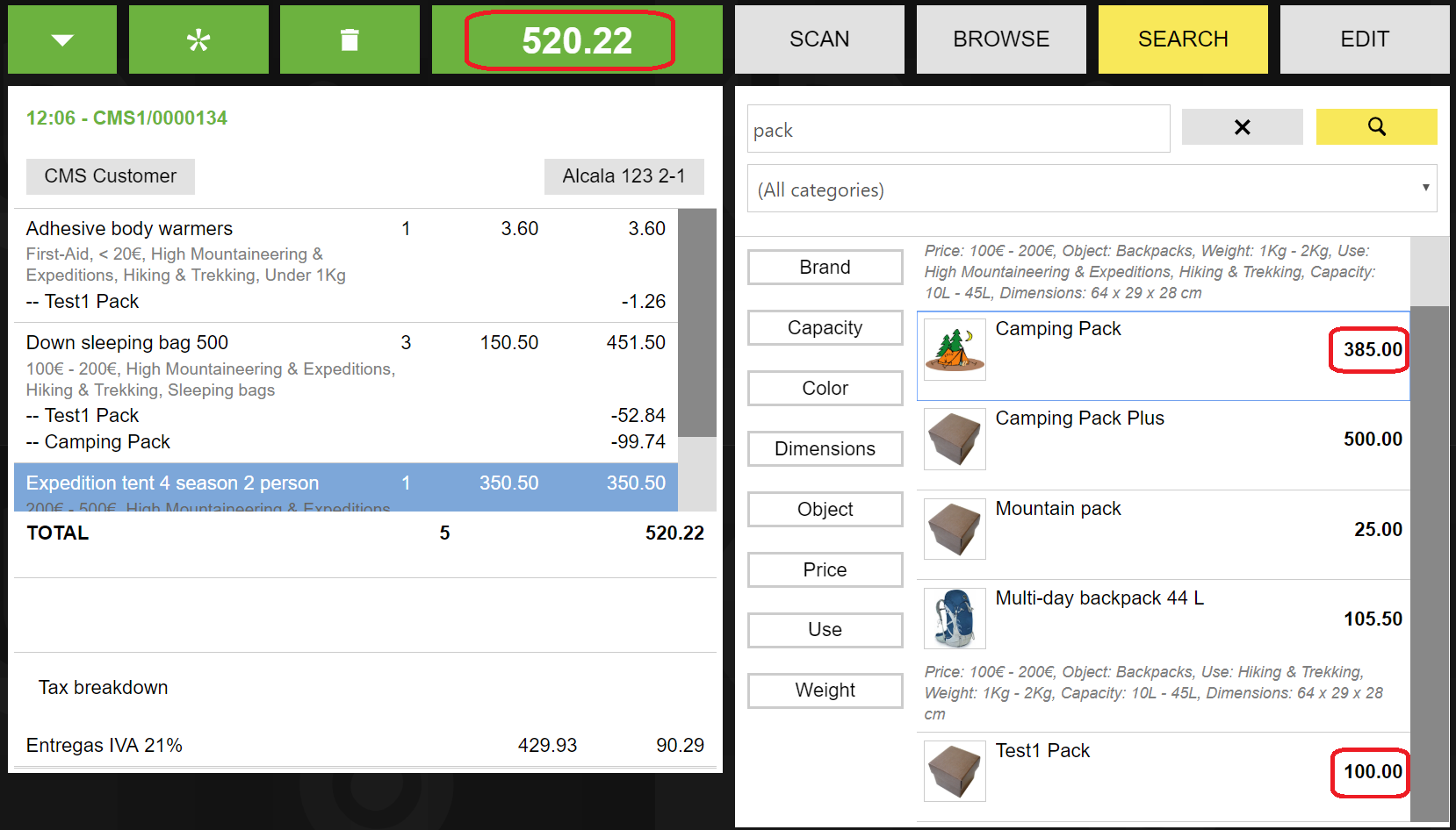 | Steps To Reproduce | 0-Log in POS backend, in Discounts and Promotions window, add the following record: -- Organization: The White Valley Group Discount/Promotion Type: Pack Name: Test1 Pack Starting Date: 01-01-2012 Included Products: only those defined Discount/Promotion Price: 100 -- Save the record. In Products tab, add: -- Adhesive body warmers Qty:1 Down sleeping bag 500 Qty:1 -- Save the record. 1-Log in POS as vallblanca. 2-Go to Search and type "Pack". Realise "Camping Pack" and "Test1 Pack" are shown there. 3-To add them, click in both aforemetioned packs: "Camping Pack" and "Test1 Pack" (385.00€ and 100€. Total amount must be 485.00€). DEFECT: Total Amount is not calculating properly both packs separately. | |||||||