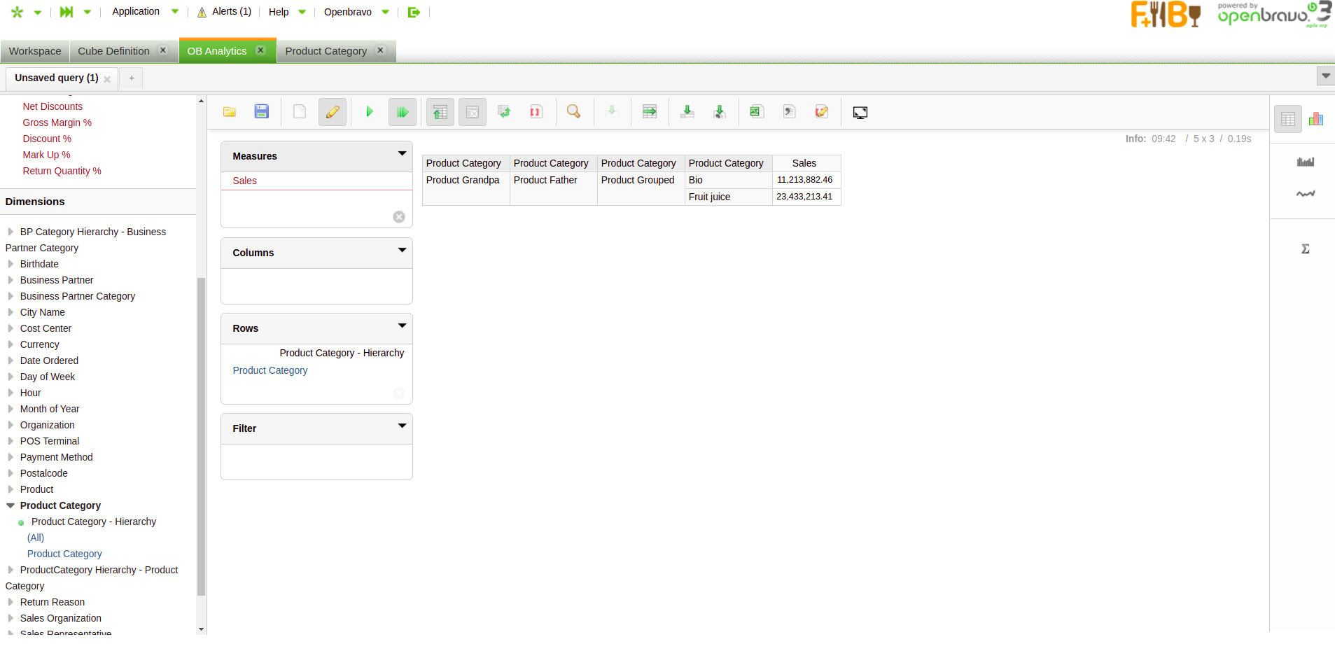 | Steps To Reproduce | *go to Openbravo livebuilds section Retail with Modules link pgsql backend *change role to System Administrator, go to Cube Definition window. Select Sales Details Fact Cube, go to its tab Cube Dimensions. Search row with productCategory as Model Element, change the field of Ignore Tree Hierarchy to not selected for that row *change role to F&B International Group Admin. Go to Product Category window. Create a hierarchy like in the attached image (Img 01 - Product Category Hierarchy.png). To make this create a new record with: Organization = *, Search Key = Product Grandpa, Name = Product Grandpa, Summary Level = selected, Seq. No = 01. Create a new record with: Organization = *, Search Key = Product Father, Name = Product Father, Summary Level = selected, Seq. No = 03. create a new record with: Organization = *, Search Key = Product Grouped, Name = Product Grouped, Summary Level = selected, Seq. No = 05. Then click on button Toggle Tree Grid Visibility, to see the hierarchy, move the products to the folders in order to have the hierarchy as seen in the image. Product Grandpa is the root, which contains Product Father, … *Go to Process Request window, create a new process: Client = F&B International Group, Organization = *, Process = Forward Update Analytics Fact Tables, Timing = Run Immediately (the rest the default values). Then click on button Schedule Process. Wait until it’s on Success Status (on tab Process Monitor, you should refresh the window to see it) *go to OB Analytics windows, select cube Sales Details Fact Cube. Add Sales on Measures (drag it from the left Measures menu to the one on the right), add Product Category on Rows (the Product Category which is inside Product Category > Product Category Hierarchy > Product Category). Then you can see the result as in the attached image (Img 02 .- Hierarchy not fully shown.png). | |||||||