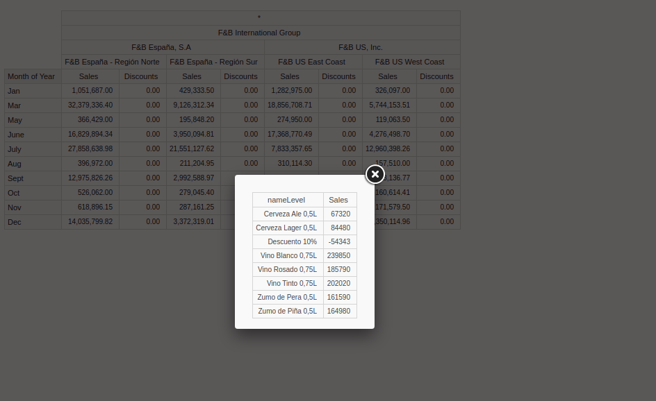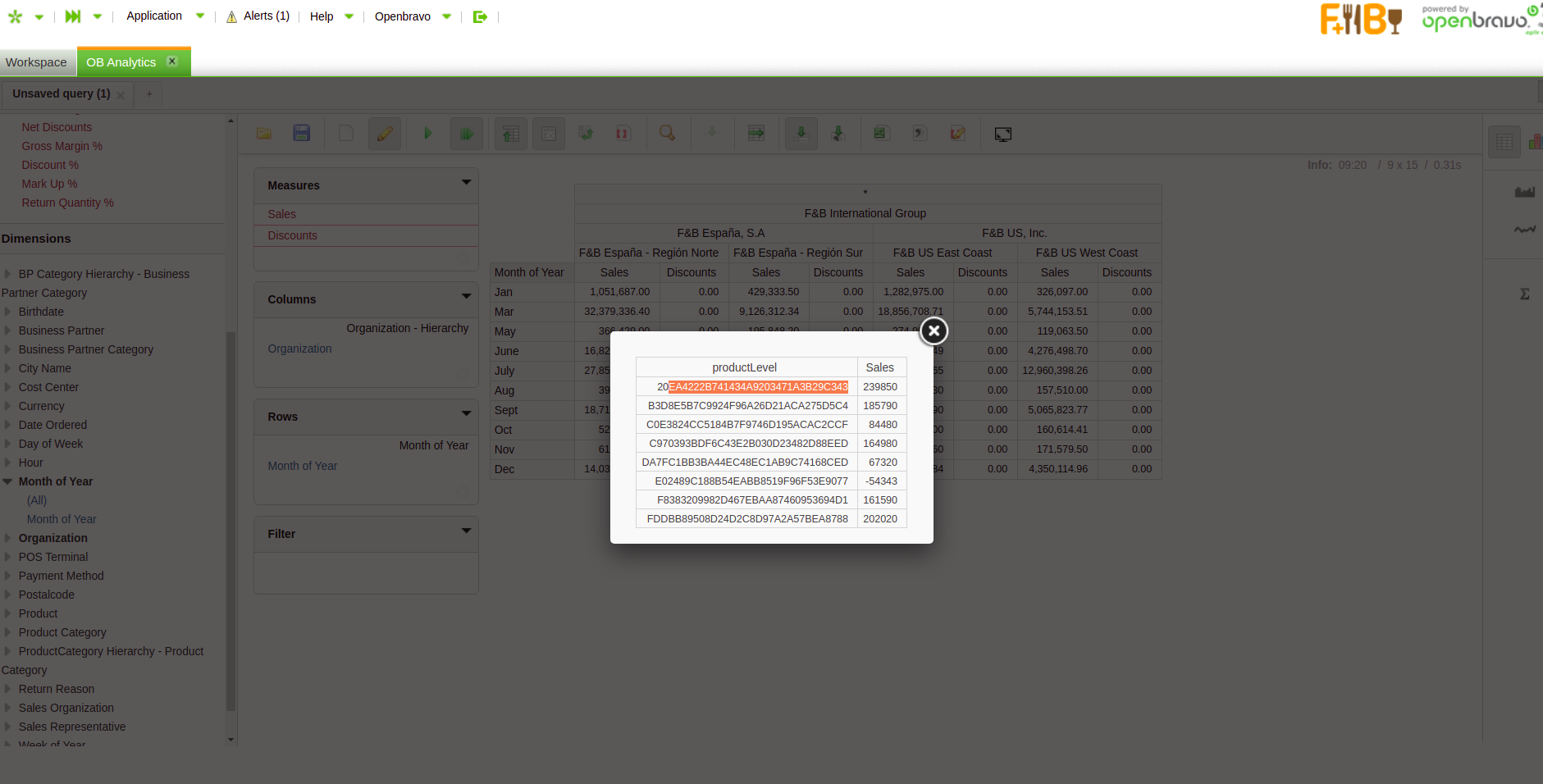 | Steps To Reproduce | *go to Openbravo livebuilds, section Retail with module click on link pgsql backend, change role to F&B International Group Admin *check if Analytics Sales Details View window is empty, if so go to Process Request window and create a new one: Client = F&B International Group, Organization = *, Process = Forward Update Analytics Fact Tables, Timing = Run Immediately. Click on button Schedule Process, wait for it to be on status Success (with the process selected go to Process Monitor tab to see its status). Now Analytics Sales Details View window should have content *go to OB Analytics window select cube Sales Details Fact Cube, add into Measures “Sales” and “Discounts”, add into Columns Organization, add into Rows Month of Year (drag them from left to the right, note that for dimensions you must expand the menu). *from the upper menu of OB Analytics (where you have buttons like Save query or Run query), click on button Drill through on cell, then select a cell of sales and january (or other cell) *in the Drill-Through popup select product as dimension and sales as measure, click ok *the output is displayed as in the image, showing id (where it was expected a name here) | ||||||||||