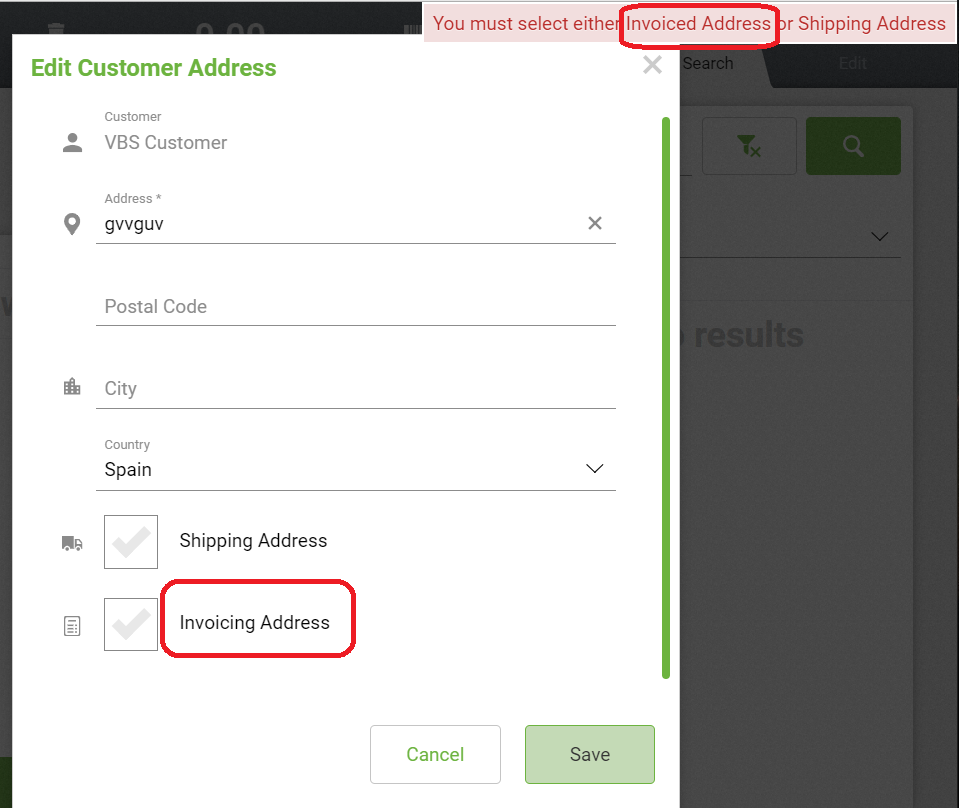 | Description | When I create/edit an address for a Customer, if I do not mark both Shipping and Invoicing addresses I receive a message: "You must select either Invoiced Address or Shipping Address". Notice the use of "Invoiced" instead of "Invoicing" In 19Q4 the message is also wrong, it is not specific of 20Q1 | |||||||||||